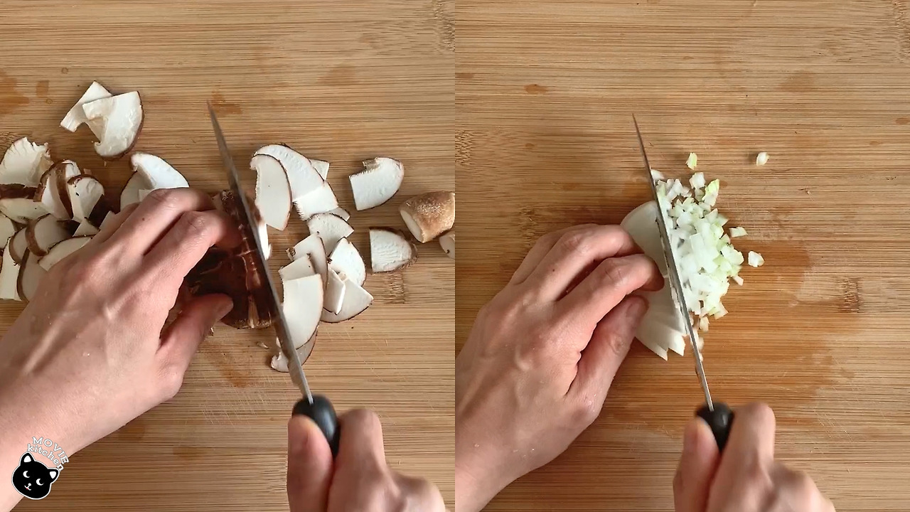 1) 표고버섯 2장은 기둥을 자르고 절반으로 잘라 얇게 썬다.