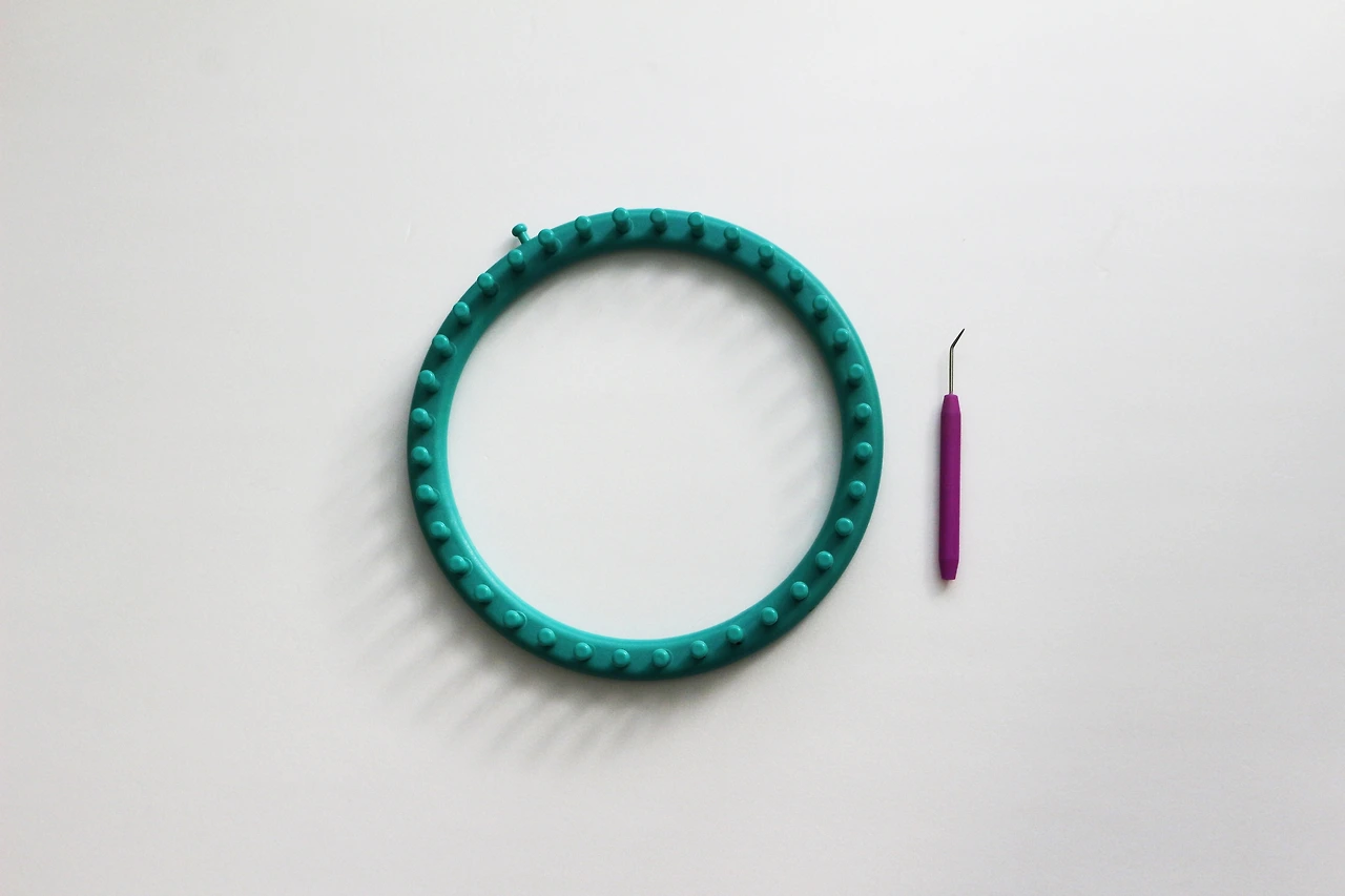 니트 모자를 뜰 때 유용한 원형 직기다. 전용 바늘을 이용해서 뜰 수 있는데 대바늘을 이용하는 것보다 훨씬 빠르다. 바구니를 뜰 때에도 활용할 수 있다. 사이즈는 다양하니 필요한 지름으로 구입하면 된다.