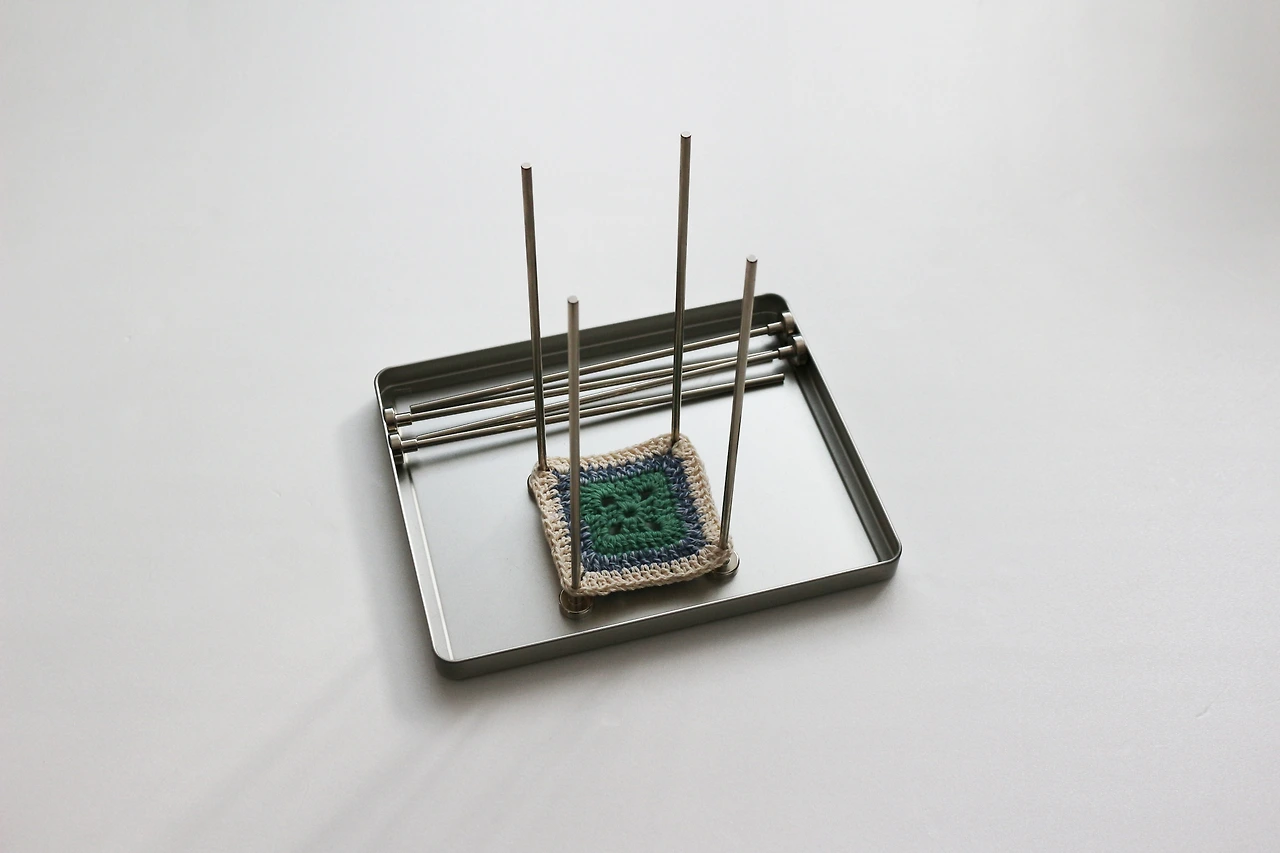 뜨개 시 모티브 패턴을 만들 때 유용하다. 이걸 발견하고 어찌나 좋던지... 자석으로 된 기둥을 세우고 물을 분무한 모티브 패턴을 고정해 둔다. 모티브들을 겹쳐 꽂아두면 일정한 모양으로 만들 수 있다.