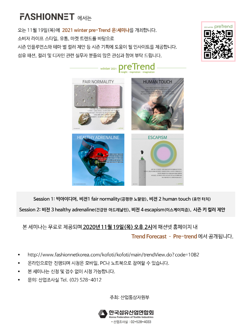 한국 섬유 산업연합회 패션넷코리아에서 진행하는 2021 Winter Pre-trend 온라인 세미나 공지가