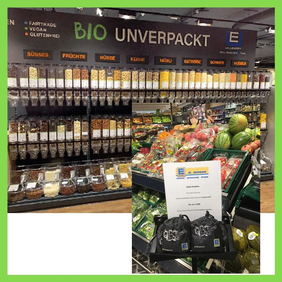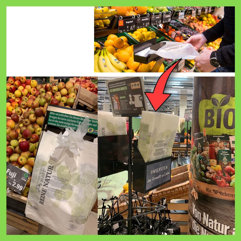 독일 대형 슈퍼 체인 Edeka는 이제 상품을 담는 비닐봉지를 완전히 없애고 종이백을 비치했어요.
