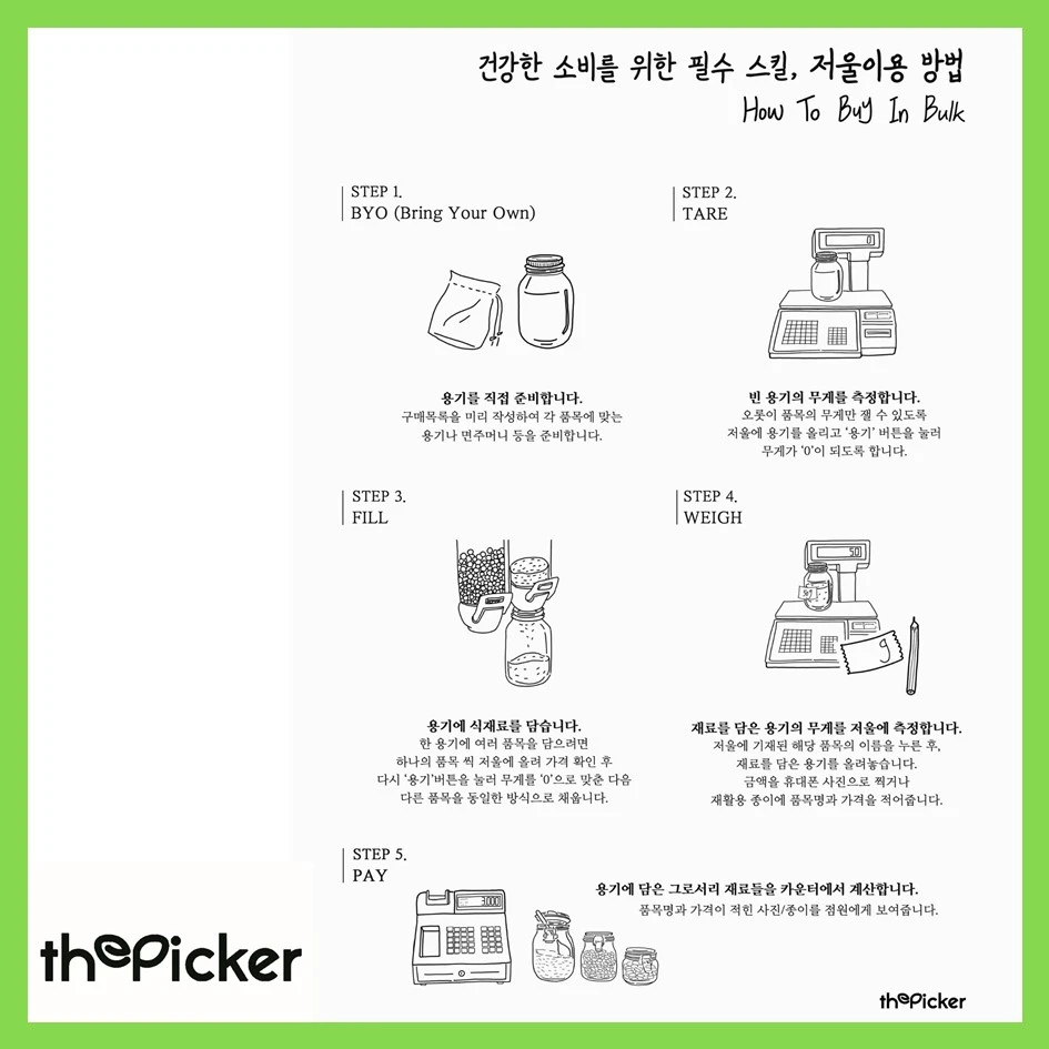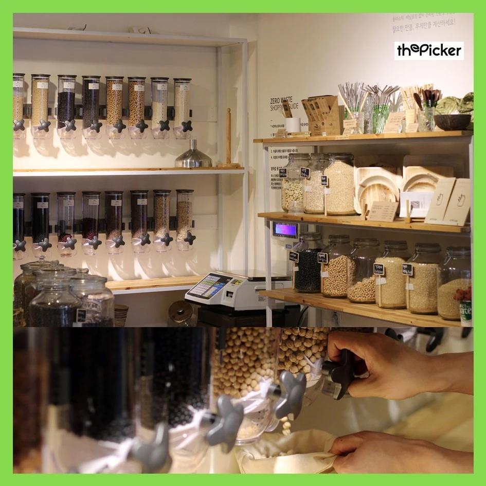 프리 사이클링(Pre-cycling)을 지향하는 가게로, 소비자가 직접 제품을 담아 갈 용기를 가지고 와서 미리 무게를 재 놓는 수고로 재활용할 필요가 없게 만드는 것이 프리 사이클링의 개념이에요.