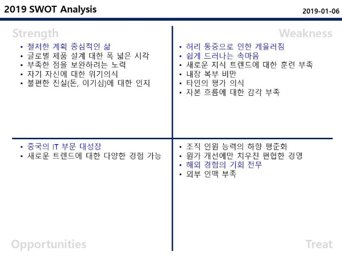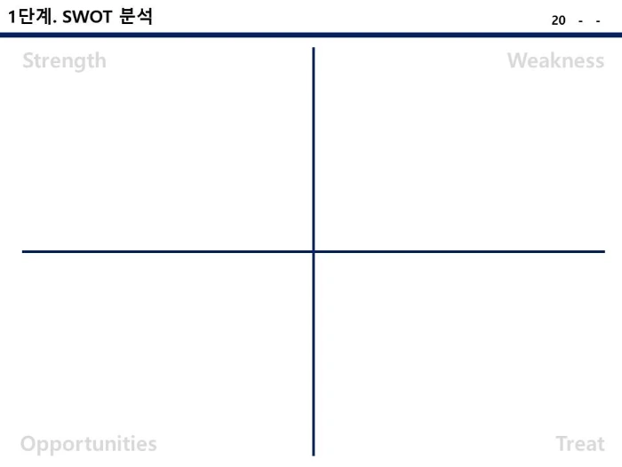 첫 번째 단계는 자기 자신에 대하여 알아보는 시간입니다. 고전적이지만 꾸준히 사용되고 있는 경영 분석 방법입니다. ‘처음부터 이게 뭐야!’ 라고 생각하기 보다는 스스로를 돌아보는 방법으로 한번 해 보세요.