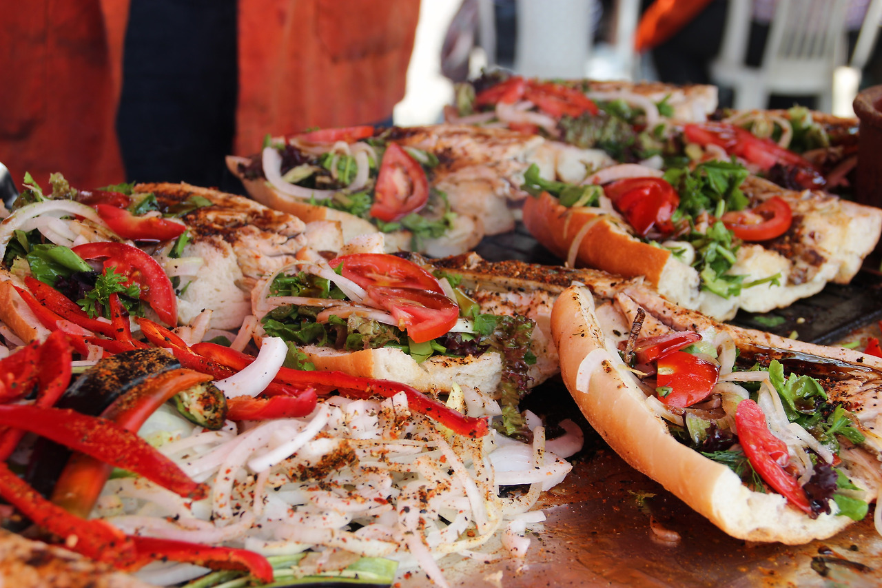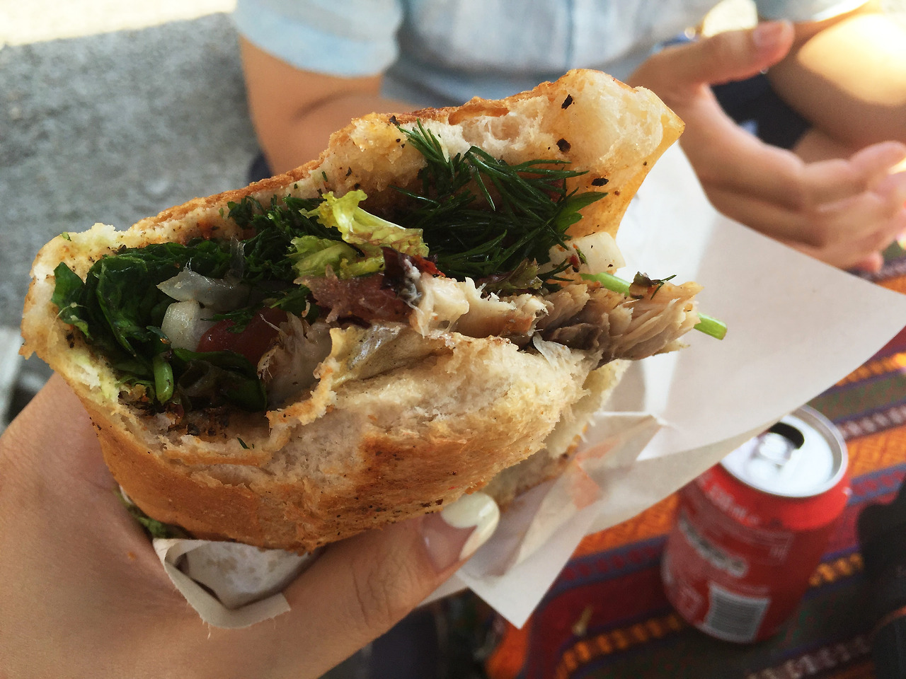 얇은 도우와 도톰한 빵 중에 선택할 수 있는데, 아마도 처음 맛보았던 바게트로 만든 고등어 샌드위치를 떠올리며 빵을 선택했던가. 고등어 길이로 잘라 반으로 갈라 펼친 빵 위에 고등어를 한 덩이 통째로 올리고, 각종 야채도 구워 올리고 향신료를 듬뿍 뿌리면 완성.