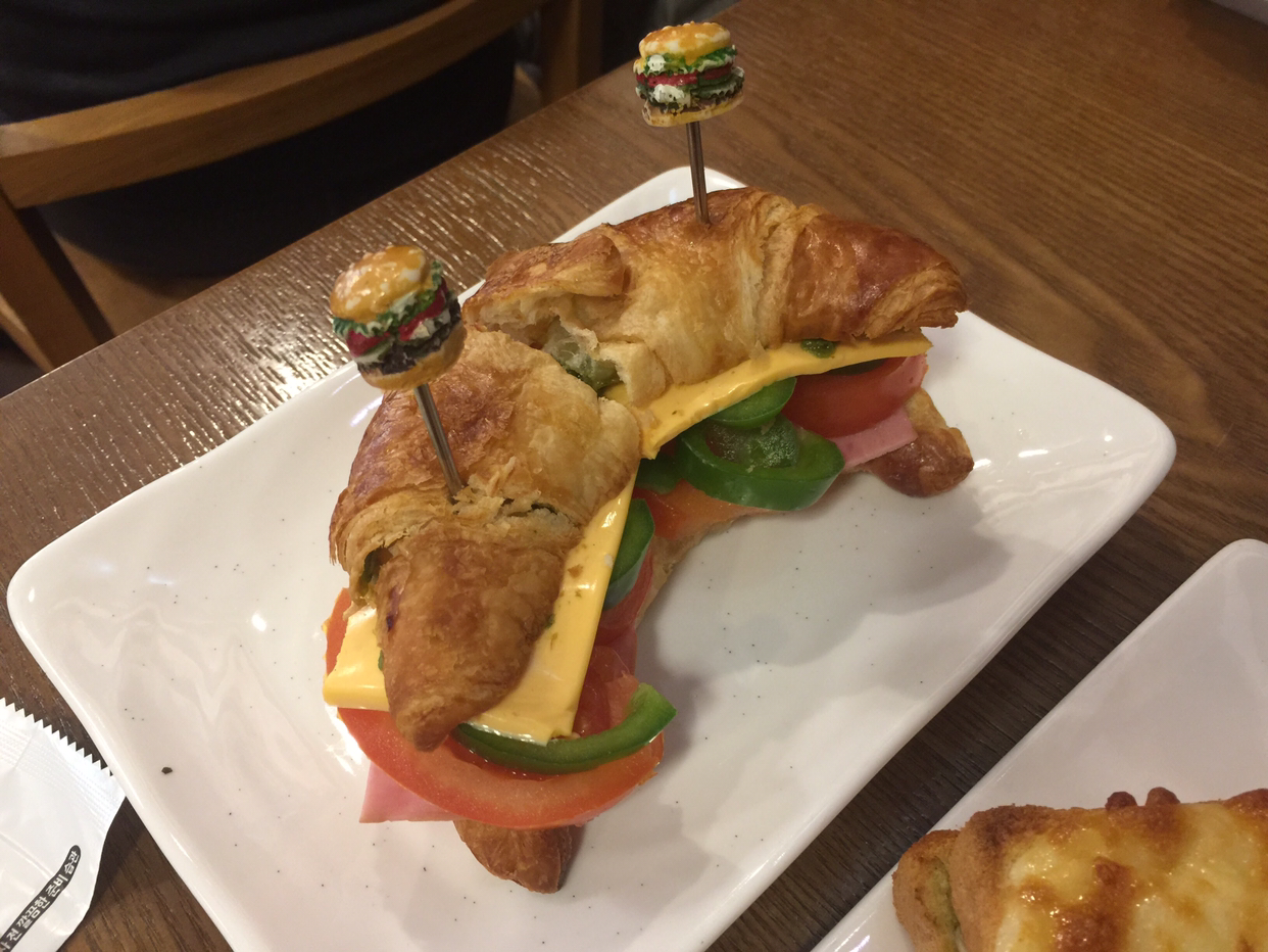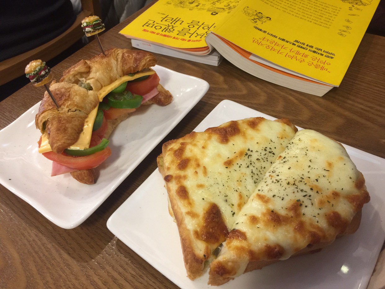 밥차리기는 커녕, 세수도 하기 싫은 일요일 아침. 후드 하나 덮어 쓰고 나가서 먹는 브런치. 크로와상 샌드위치와 크로크무슈를 하나씩 시켰는데 여기에 커피까지해서 7천원. '브런치'라는 단어에 거품이 올려진 가격이나 이미지와는 거리가 멀다.