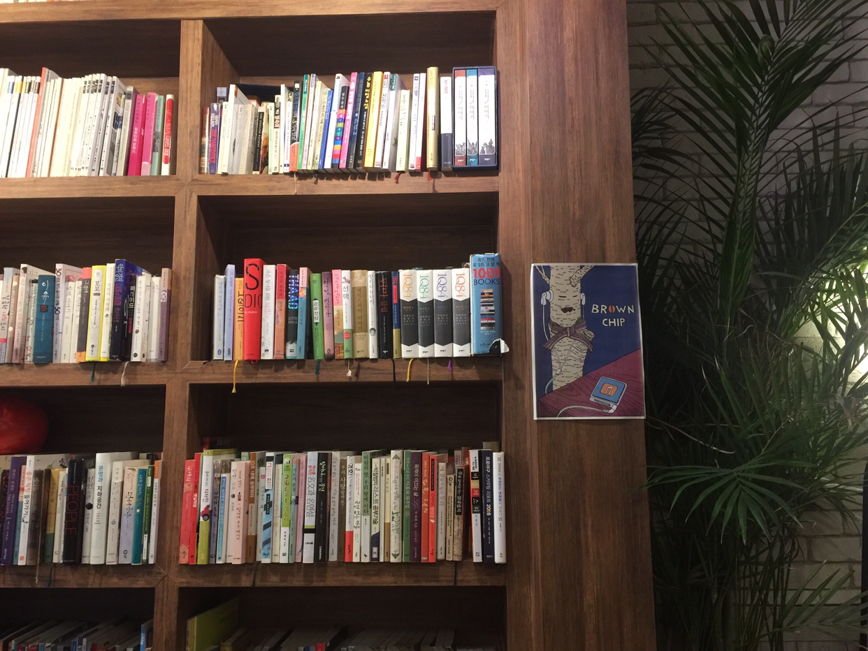 <브라운칩>의 벽 한면은 책으로 빼곡하다.