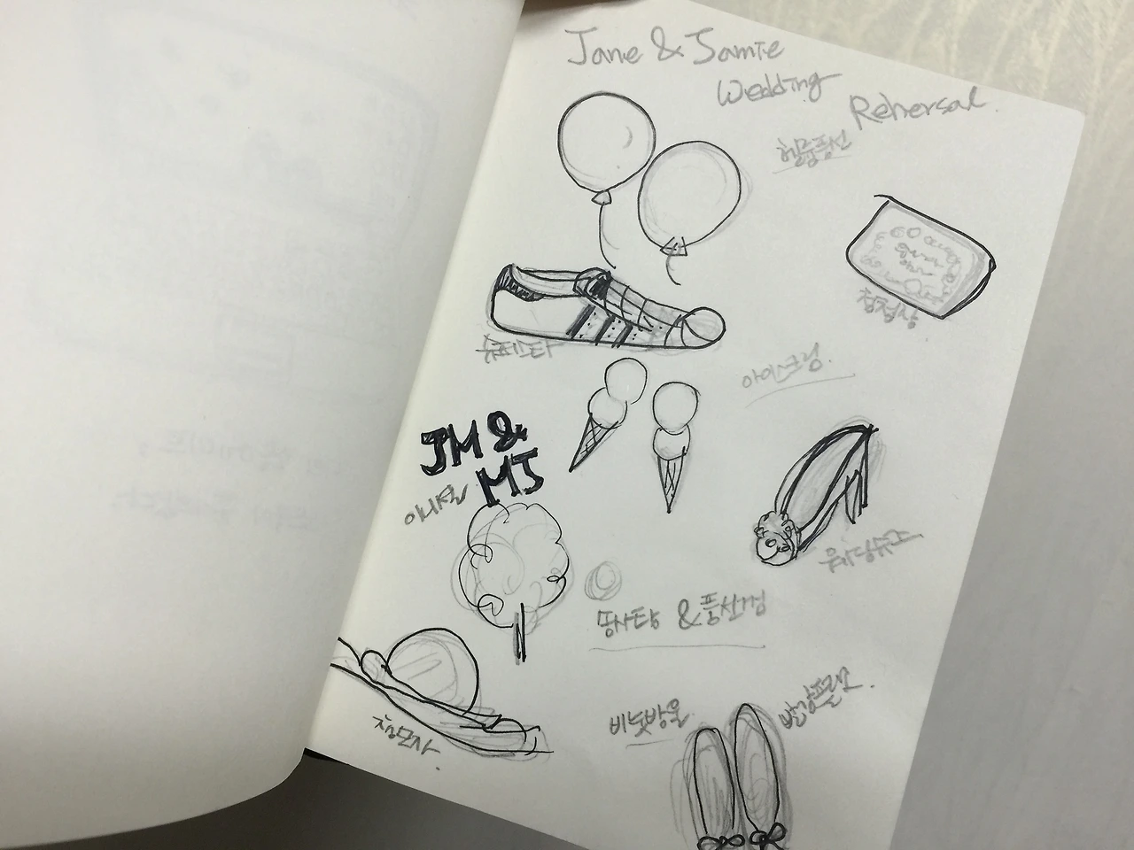 소품은 우리가 좋아하는 것들을 떠올리며 끄적거린 낙서에서 시작해 준비했다. 챙긴 것도 있고, 비슷하게 취한 것도 있고, 못 챙긴 것도 있다. 이 역시 의도된 계획과 우연의 순간들이 조합되어 우리만의 결과물로 만들어졌다. 무척 우리답게.
