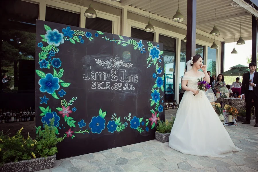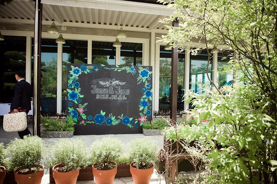 결혼 준비하며 수 없이 수집한 레퍼런스를 훑으며 꼭 하고 싶었던 '웰컴보드'. 우리의 청첩장을 모티브로 만들어졌다. 나는 신부대기실로 마련된 곳에 '대기'하지 않고 내내 이 앞에 서서 손님 '맞이'를 했다.