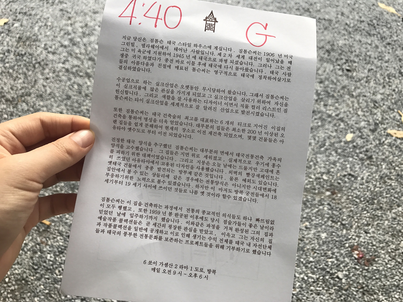 ‘짐톤슨 하우스’는 구석구석 아름다웠다. 그 공간을 전시재로 활용하는 무용성은 경험한 이들에게 깊게 작용한다. “방콕에 가면 그런데가 있대.”정도로는 전달되지 않는 축축한 감동에 사로잡히는 것이다. 이 경험은 “그 사람 매력적이네, 사랑에 빠질만 하다.”와 “그 사람과 사랑에 빠졌어.”가 완전히 다른 감각과 완전히 다른 경험인 것과 같다. 그러니 그 아름다움은 완전히 유용한 경험이리라.