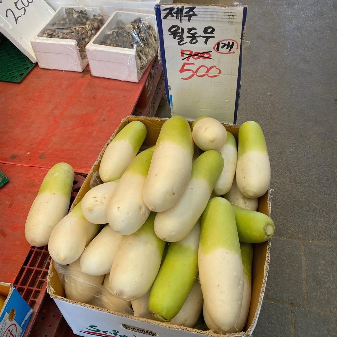제철 맞은 식재료는 맛도 맛이지만 작물이 풍성하기 때문에 싸기도 싸다. 싸고 맛있다니, 일거양득. 시장을 지나다 '제주 월동무' 가격 보고 깜짝 놀랐다. 커다란 무우를 사다가 며칠을 먹겠고만 500원이라니! 요즘 붕어빵 한 마리랑 같은 가격이다.