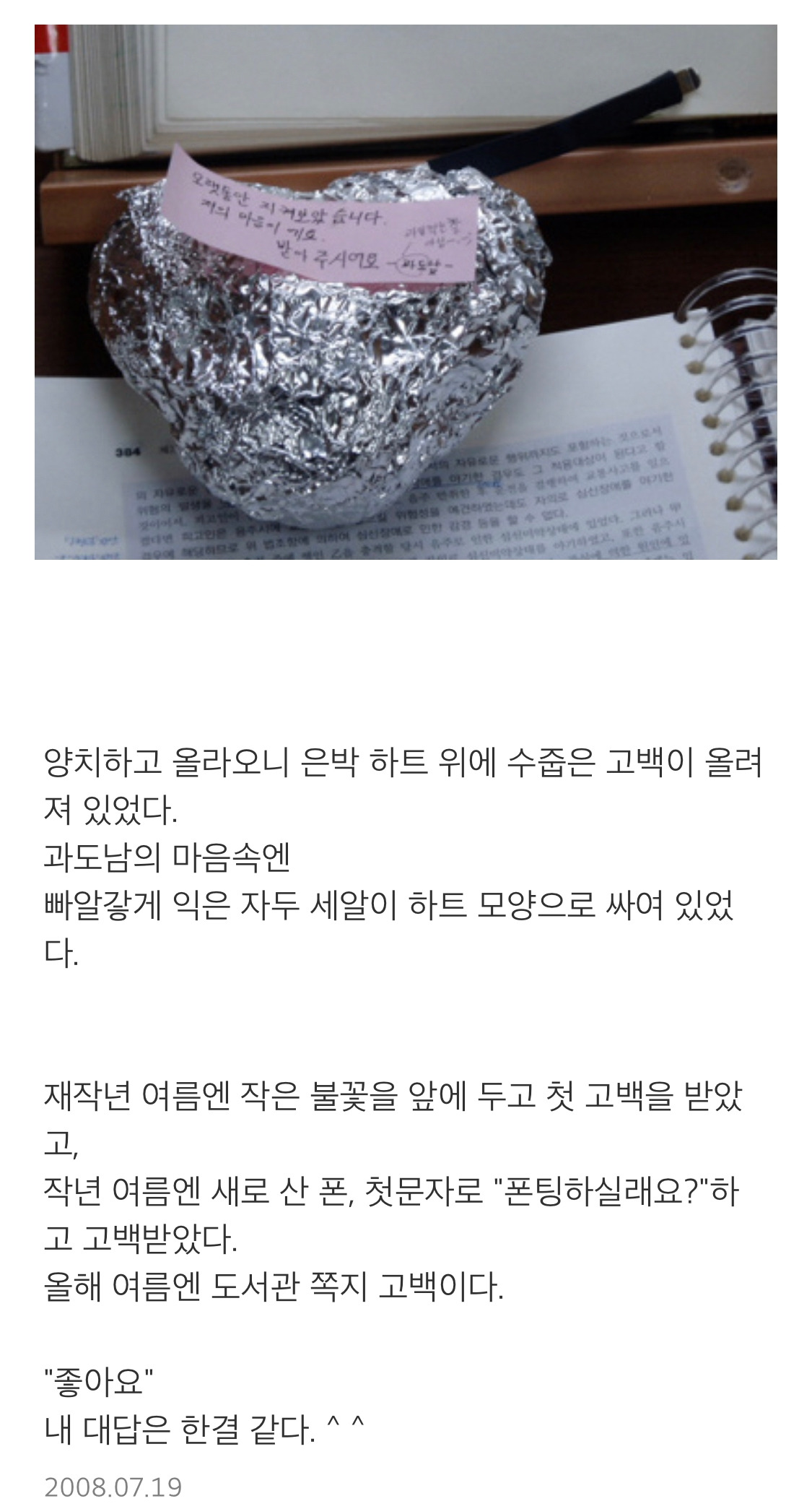 이야기는 바야흐로 연애하던 시절로 거슬러 올라간다. 싸이월드 미니홈피의 기록을 뒤져보니 08년도 내 나이 스물 넷이던 시절이다. 도서관에서 자리 잡고 공부할 때, 끼부리는 쪽지 하나를 얹어 자두를 건네던 남자 친구가 지금의 남편이 되었다.