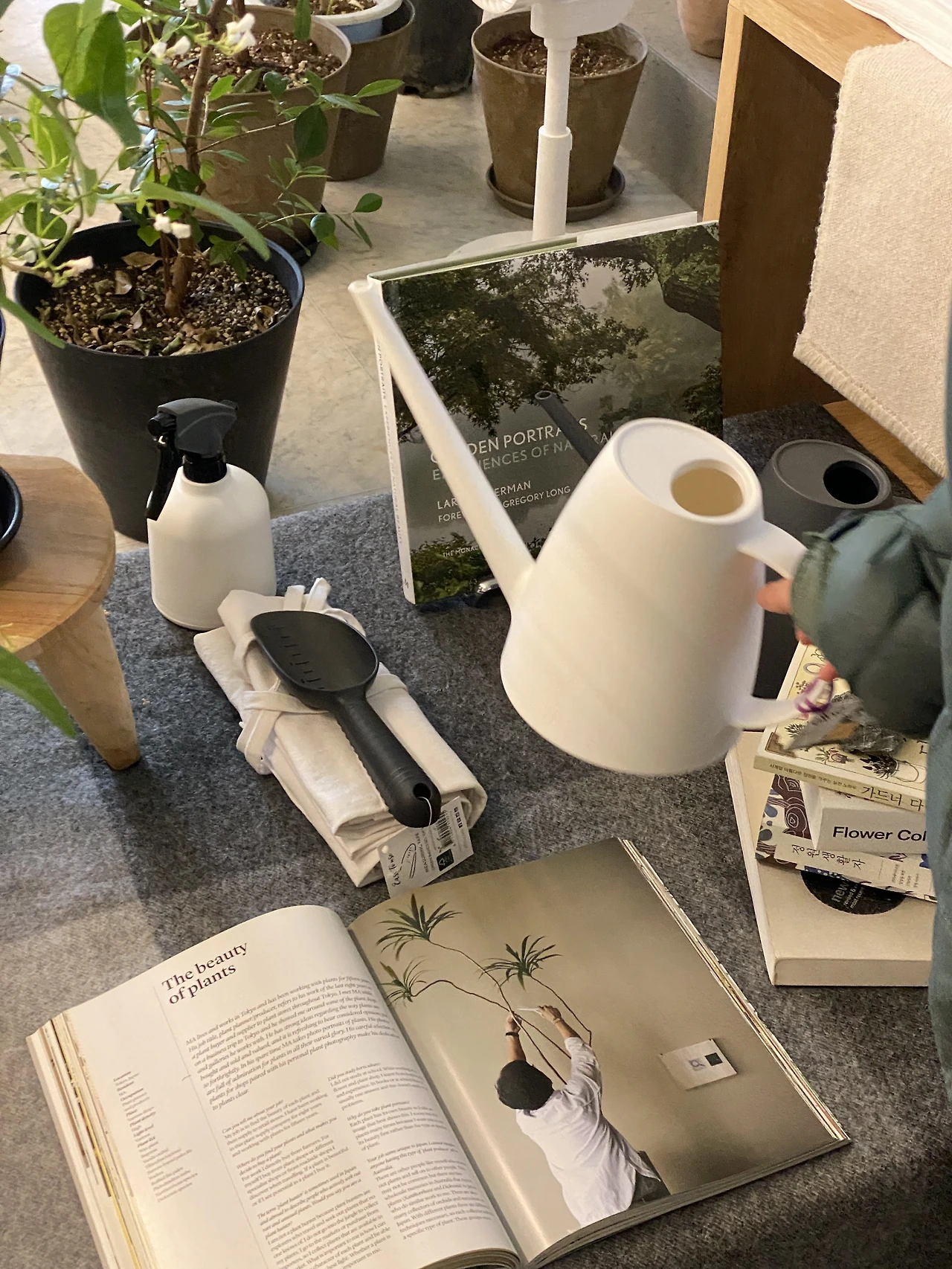 엄청 고심해서 가져다 놓은 식물, 화분, 페브릭 그리고 작은 정원도구들.