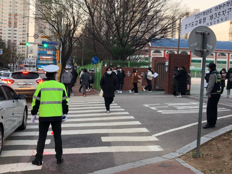 지난 3일 오전 7시 20분 경기 안양시 부흥고등학교 앞. 신종 코로나바이러스 감염증(코로나19)이 맹위를 떨치기 때문인지 대학수학능력시험(수능) 경기도 교육청 제35지구 제7시험장 앞은 차분했다. 후배들과 선생님들의 힘찬 응원 대신 플래카드가 걸려있다. 들리는 건 시끌벅적한 응원이 아닌 수험생들의 차량을 안내하는 경찰들의 목소리였다. 방역수칙이 강화된 입실 과정에서 생길지 모르는 변수를 의식한 듯 이른 시간부터 차량이 몰렸다.