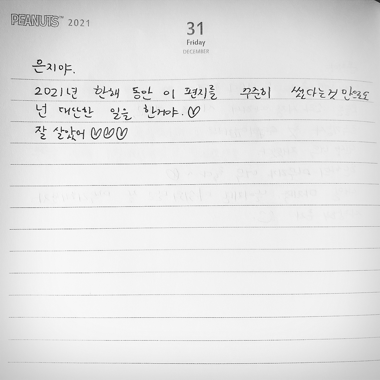 <나에게 쓰는 편지>는 2021년 1월 1일부터 12월 31일까지 매일 한 장씩 다이어리에 스스로를 위로하고 북돋으며 살아냈던 내 삶의 생생한 기록이다.