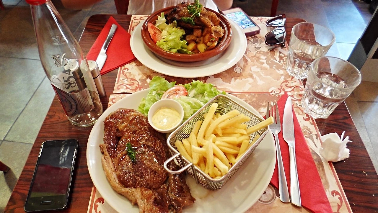나의 양파수프는 그냥 양파 맛이었고, 언니의 달팽이 요리는 생각보다 맛있었다. 전채요리를 다 먹고 본식을 기다리는데, 텀이 너무 길어서 더 배가 고픈 것 같았다. 드디어 나온 본식! 나의 스테이크는 정말 기대 이상이었다. 이 정도 크기의 스테이크를 한국에서 먹으려면 적어도 4만 원 이상은 내야 할 텐데, 맛도 훌륭했다. 다만 처음에 스테이크 칼을 주지 않아서 고기를 억지로 자르느라 고생했다.
