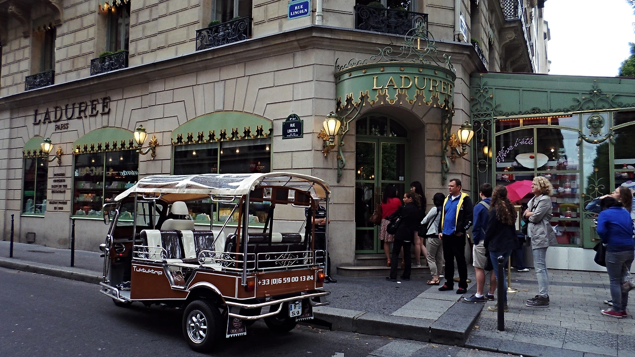 거의 다 먹어갈 즈음에 비가 내리기 시작해서 우산을 펴고 다시 샹젤리제로 갔다. 이번엔 반대편 길로 가보자는 생각에 한 손에는 천도복숭아를 들고 와그작 베어 물며 거리를 걸었다. 가는 길에 멋진 차량이 전시된 곳도 구경하고, 저번에는 못 봤던 그 유명한 ‘La Durée’ 매장도 보았다.