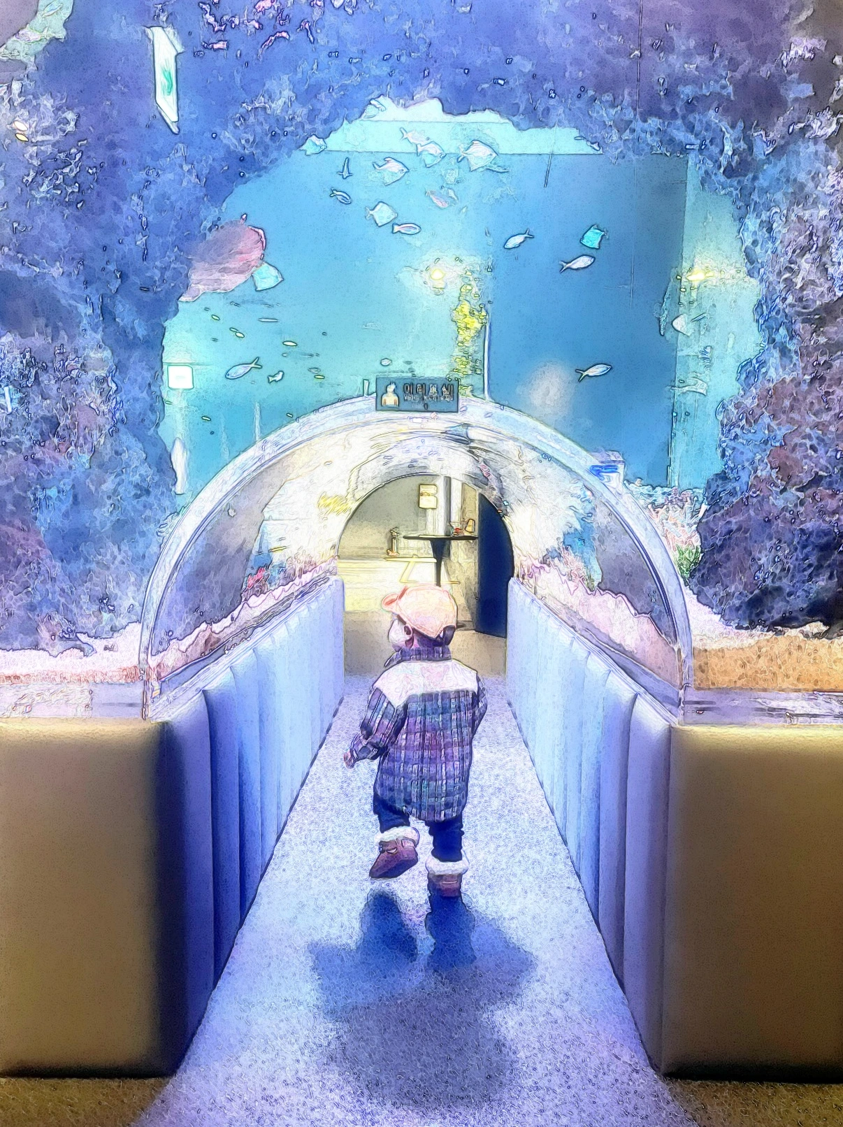 바닷속 같은 길을 걸으며 신기한 세상을 구석구석 들여다보네요.