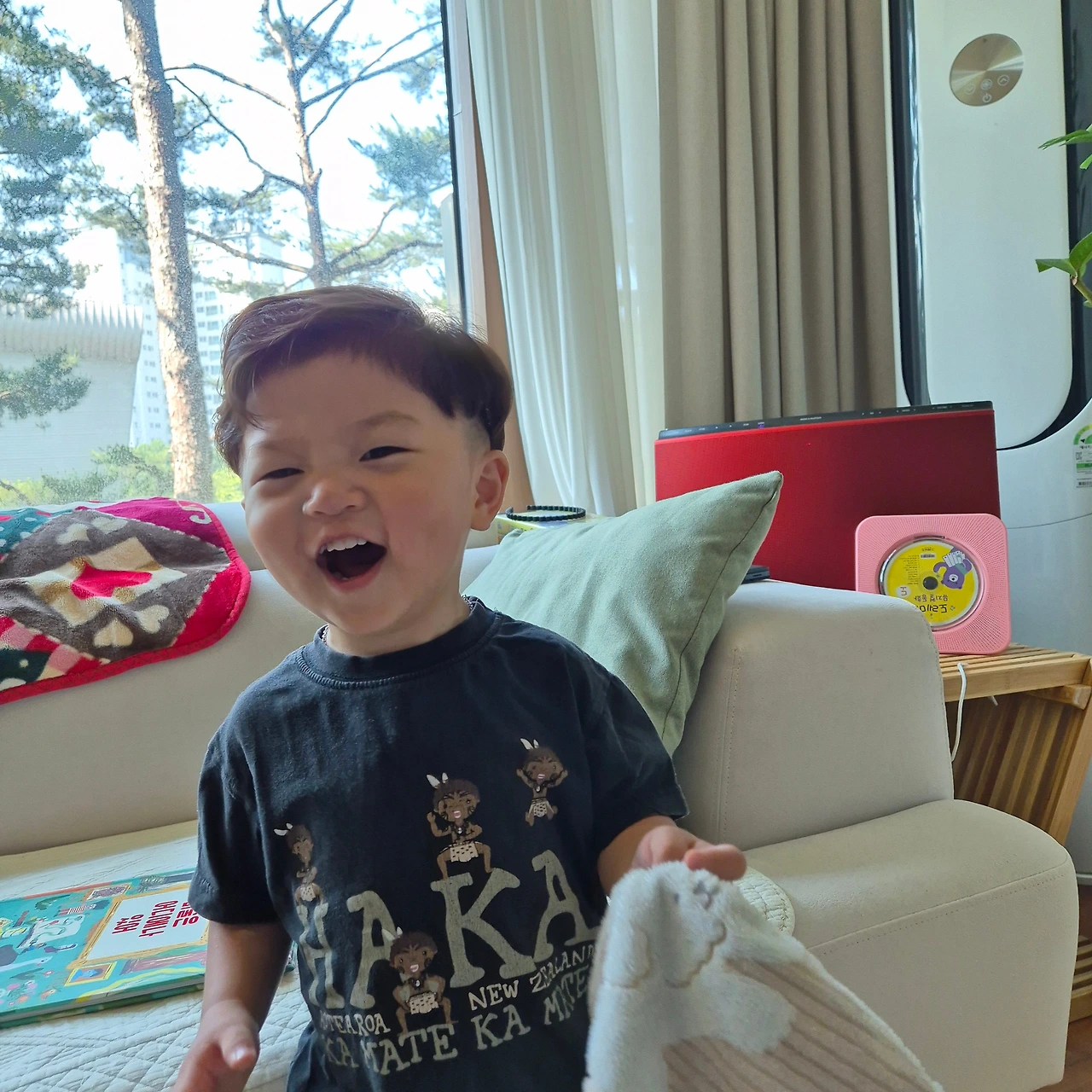아기는 보상으로 받은 책을 들고 폴짝폴짝 기분이 좋단다.