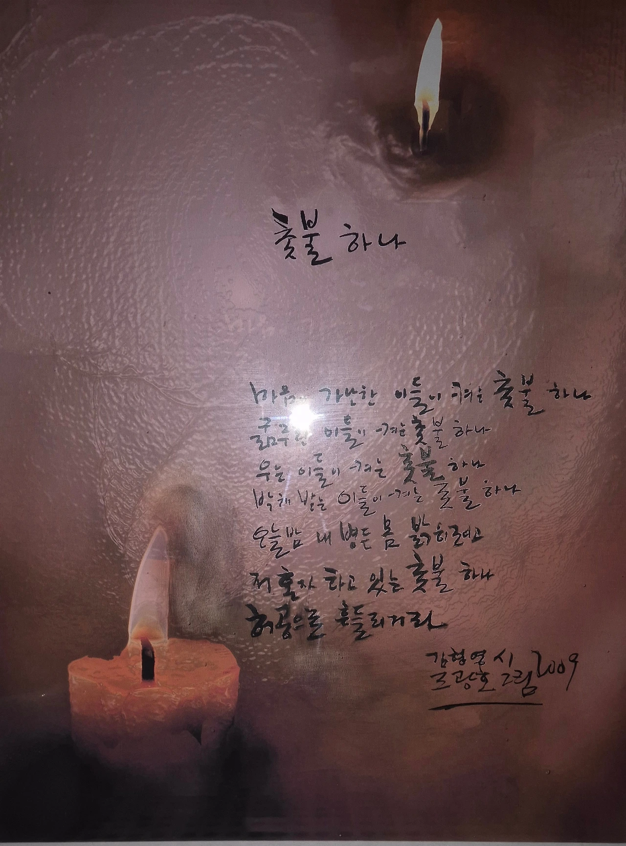 30년 전 선생님께서는 이미 '한강'이라는 작가를 눈여겨보시고 선생님이 평생 몸담으셨던 잡지 [샘터]의 기자로 부르셨다고요. 그녀의 작품들을 문화영성 잡지 <들숨 날숨> 창간호에 게재하는 등 많은 힘을 쓰셨다고요. 아, <들숨 날숨>은 이제 없어진 거 알고 있습니다. 폐간 전 몇 호정도는 저도 받아 보았으니까요. 한강 작가를 향한 선생님의 믿음은 무한하셨다고 들었습니다. 저도 기억합니다. 언젠가 작은 모임에서 한강 작가의 진실을 향한 예리한 시선이 남다르다는 말씀을 하셨지요. 그 말씀을 하실 때 선생님은 행복한 미소를 지으셨어요. 물론 저는 한강이라는 작가를 잘 몰랐었지요. 다만 제가 시를 전공하고 논문을 준비하는데 지도교수가 홍**라 말씀드렸더니 그의 아내가 한강이라고 말씀해 주셨죠. 그렇게 입에 침이 마르도록 칭찬과 격려를 마다하지 않은 딸 같은 작가가 세계가 주목할 만한 큰 일을 해 냈다구요 선생님.
