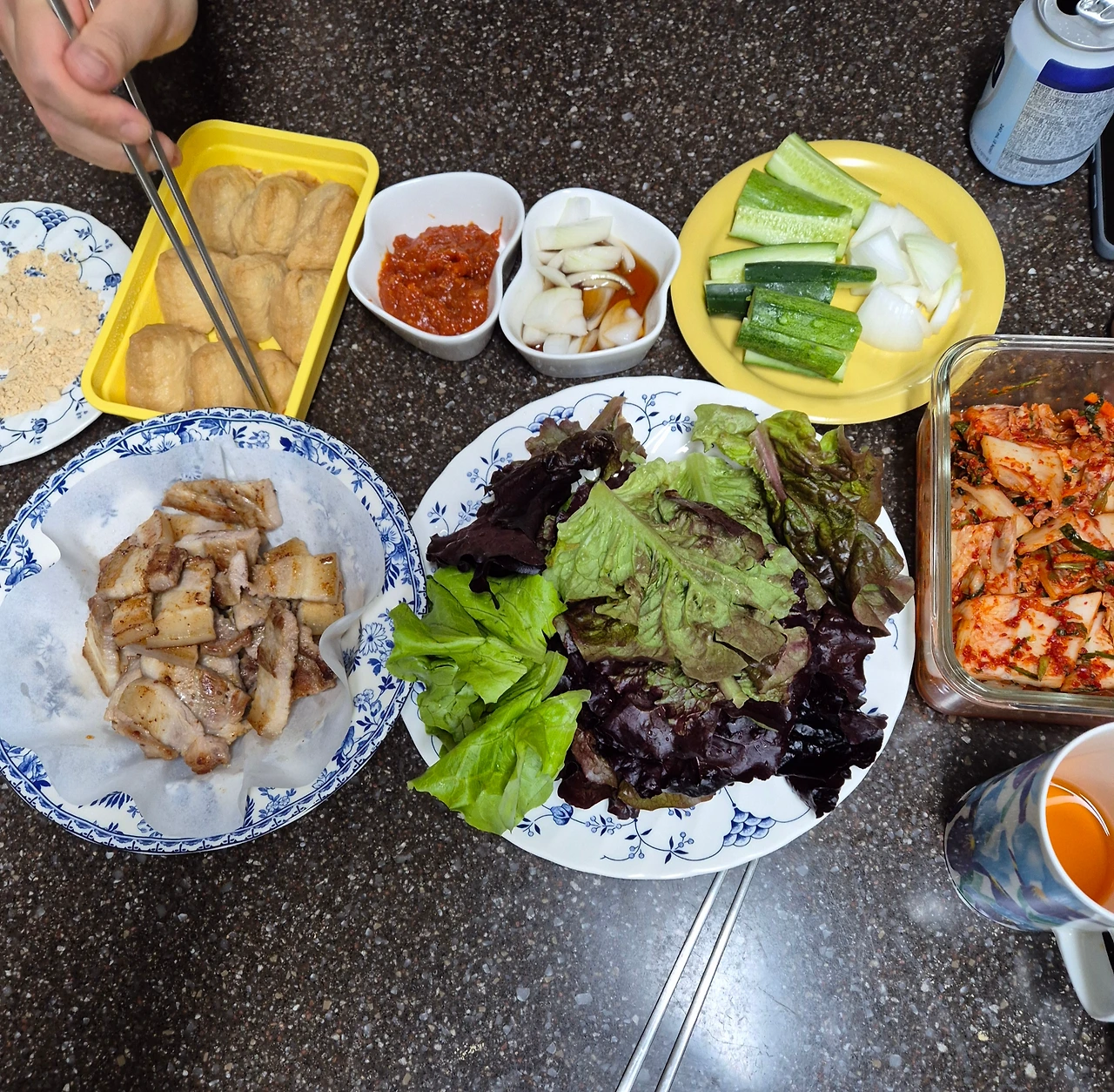 직접 키운 상추를 삼겹살에 싸서 한입 가득, 로리는 입도 크게 잘 벌리고 먹는 것도 복스럽게 잘 먹는다.