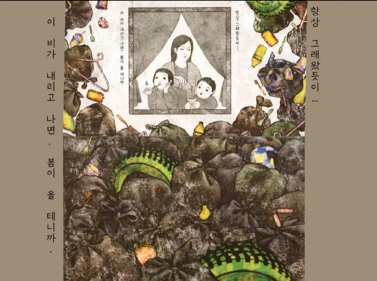 마지막 장은 특히 큰 울림을 준다. 창밖에는 쓰레기더미가 가득 쌓여 있고, 창 안의 엄마와 아이 둘은 멍하니 그것을 바라본다. 그리고 다음 문장으로 마무리된다. "그래, 아직 봄이 오지 않았을 거야." 이 문장은 독자에게 질문한다. 봄은 저절로 오는 것일까? 우리가 아무런 노력을 하지 않아도 따뜻한 계절이 찾아올까?
