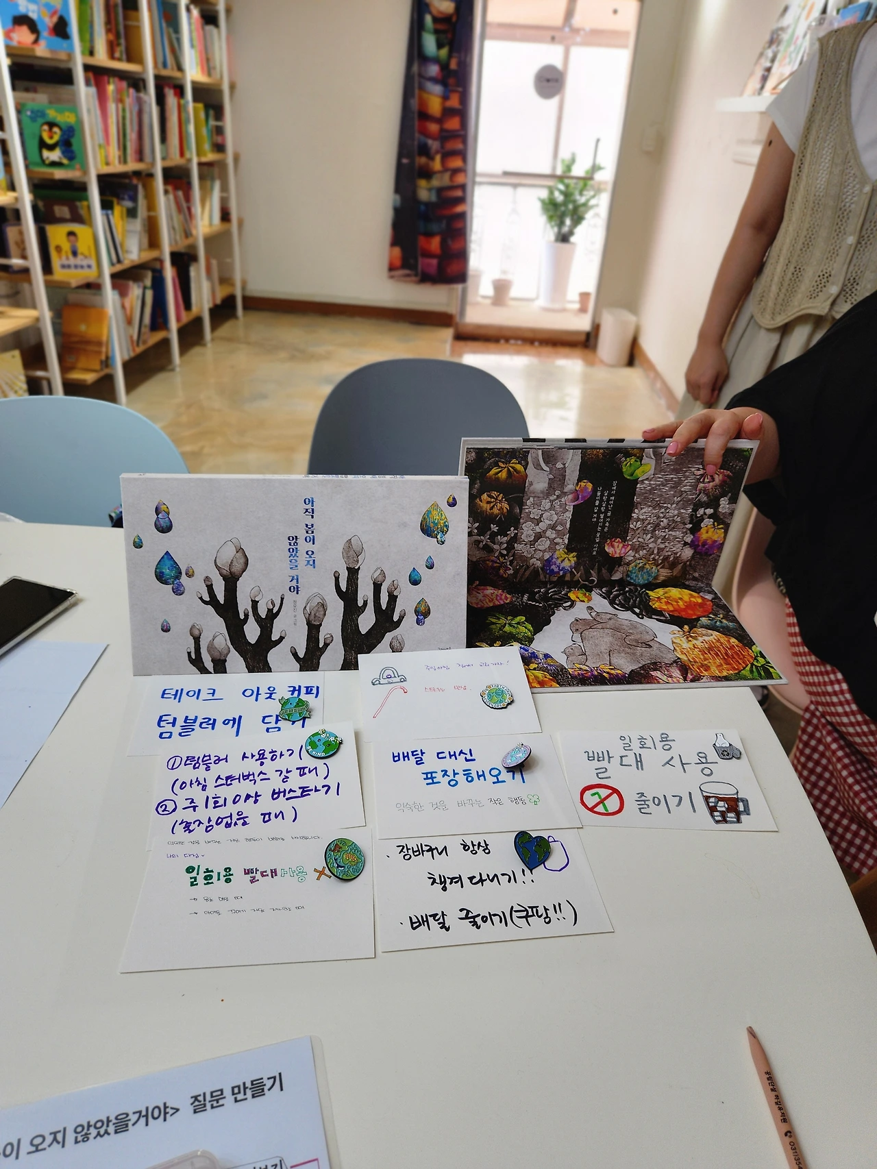 정말 익숙해서 사소하게 흘려버리는 것들이다. 하지만 교사들이 먼저 실천하는 모습을 보여주면, 아이들이 금방 따라가게 될 것이다. 아이들 앞에서 텀블러를 쓰면 '왜 종이컵은 안 써요?'라고 물을 수 있지만, 그 질문 하나가 수업보다 더 큰 가르침이 될 수 있다.이들은 책 속 이야기를 아이들의 언어로 다시 풀어내어 환경 동화를 만들기도 한다. 그림책에서 깨달은 메시지를 생활 속 행동으로 옮기는 것이 이 모임의 가장 큰 특징이다.