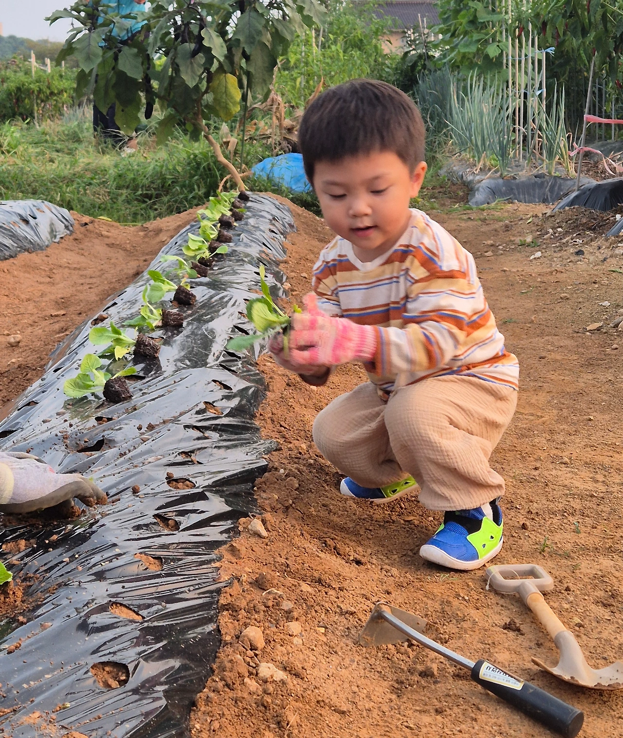 “할머니, 갈퀴 좀 주세요. 로리가 도와줄게요.” 갈퀴가 필요한것 같지는 않은데 갈퀴를 달라고? 흙을 긁으며 놀고 싶은거겠지 하며 돌아보니 장갑을 낀 로리는 단단히 준비된 모습이었다. 아빠가 호미를 들자 이번엔 호미를 달라며 모종을 흙에 꽂고 다니며 종알거린다. 작은 손으로 흙을 다독이며 “잘 자라야 해”라고 속삭이는 모습이 대견하다. 돌 무렵부터 김치를 잘 먹던 로리가 이제는 스스로 배추를 심고 있다. 로리가 심은 배추가 자라 김치가 되어 식탁에 오른다고 생각하니, 텃밭과 밥상, 아이의 성장과 환경이 모두 이어져 있음을 실감한다.