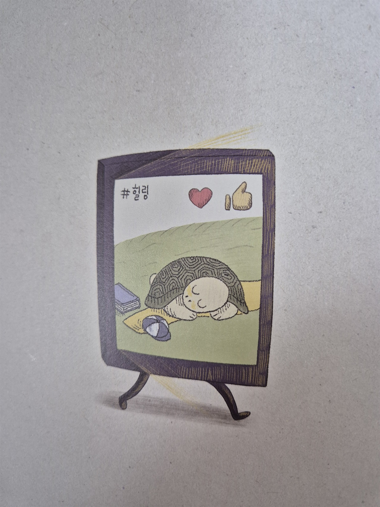 짧은 문장이지만, 타인의 시선에 길든 우리의 마음을 정확히 겨눈다. 그림 속 거북이는 천천히, 그러나 확실히 자신을 향해 걸어가고 있다. 그는