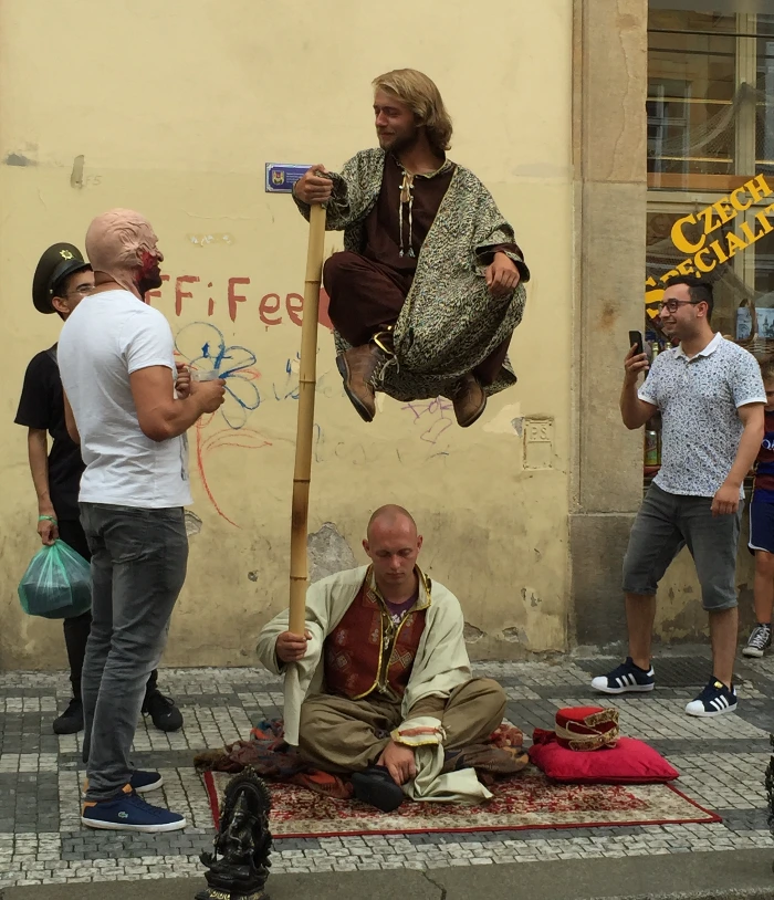 까를교를 건너기 전 어느 상가 앞에서 눈을 의심할 수밖에 없는 광경을 본다. 눈이 마주쳤다. 그는 웃는다. 서 있는 사람들을 둘러보며 지긋이... 공중에 떠 있는 저 사람은 무엇을 보여주고 싶은 걸까. 무엇을 알리려 말없이 말을 하고 싶은 걸까. 대나무 봉을 잡고 돌길 위에 앉은 저 사람은 무슨 생각을 하고 있는 걸까. 눈앞의 광경이 신비롭기까지 하면서도 나는 저들의 마음을 읽고 싶었나 보다. 좀처럼 발길을 뗄 수가 없었다.