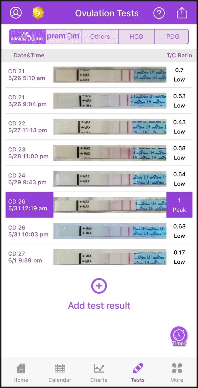 택배 도착 예정일 전날은 친구들과 오랜만에 만나 노는 날이었다. 5월 26일 화요일, 저녁 늦게 아르바이트가 끝나자마자 친구네 집으로 향했는데, 이상하게 음식을 많이 먹지도 못했는데 속이 더부룩하고, 어지럽고, 토할 것만 같았다. 결국 창백한 얼굴로 친구들에게 걱정만 끼치다가 집에 돌아와 보니 배송 예정일보다 하루 일찍 택배가 도착해 있었다. 갑자기 아프던 배가 싹 나았다. 택배 상자를 바로 뜯었고, 호기심을 이기지 못한 나는 바로 테스트를 했다. *Premom이라는 앱을 다운로드받아 소변 컵에서 뺀 후 7분이 지난 테스트기의 사진을 찍으면 결과 수치를 자동으로 보여준다. 결과는 테스트/컨트롤 지수 (T/C Ratio) 0.7, 배란에 의한 임신 가능성 낮음 (Low)이었다. 아직 배란일까지 열흘은 남았을 거라는 예상에 비해서는 높은 편이었다. 나는 곧 배란일이 다가오는 걸까, 아니면 다낭성으로 인해 365일 높은 수치를 내뿜는 것일 뿐일까? 임신을 마음먹는 순간부터 내게 평온과 안정이 없을 거라는 건 예상했지만, 이렇게까지 모든 소소한 일에 걱정이 앞설 줄은 몰랐다.