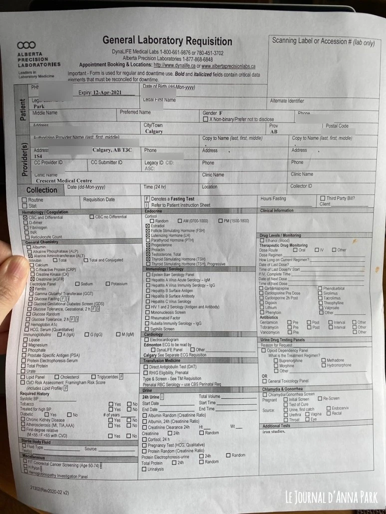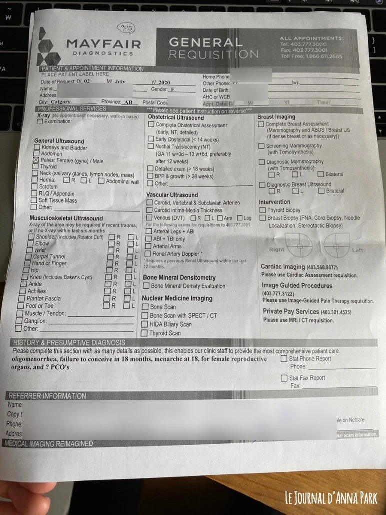 6월 29일 슬픔의 고배를 마신 뒤, 6월 30일 생리를 시작했다. 맘카페를 열심히 찾아보니 불임으로 병원을 찾는다면 생리 2-3일 차에 가는 것이 좋다고 한다. 생리 2일 차인 7월 1일, 집 근처 클리닉에 전화했다. 아쉽게도 당일 방문은 불가능하고 다음 날 찾아오라고 했다. 의사를 만나자마자 모든 이야기를 했다. 첫 생리가 얼마나 늦게 시작했는지, 얼마나 불규칙한지, 어떤 노력을 해왔는지 떠듬떠듬이지만 전부 말했다. 하나도 빠짐없이 말해야 할 것 같아서 노트에 영어단어도 정리해두고, 전날 샤워하면서도 전달력을 높이기 위해 엄청나게 연습했다. 캐나다 맘카페에서 보니 캐나다 의사들은 만 35세 미만의 여성/임신 시도 1년 미만인 환자에게는 열심히 집에서 시도해보라며 응원만 해준다는 소문이 있길래 약간의 거짓말.. 아니 좀 크게 거짓말을 했다. "결혼한 지 1년 반 정도 되었고 (사실) 1년 반 내내 시도했으나 (왕거짓) 마음처럼 임신이 쉽게 되지 않는다. 한국에서 산부인과에 갔을 때 한 번도 Polycystic Ovary Disease (PCOS=다낭성)라는 진단을 받은 적은 없지만, 나 스스로 의심이 되니 한 번 여기서 다시 검사해 보고 싶다." 아니나 다를까 일반 클리닉에서는 아무것도 해주지 않는다. 그냥 피검사와 초음파검사를 연결해줄 테니 스스로 예약하고 검사받고 오라는 말만. 생리 사흘 차에 후다닥 병원을 찾은 의미가 없었다. 그나마 검사는 해준다니 감사히 종이(Requisition Form)를 받아들고 나왔다.