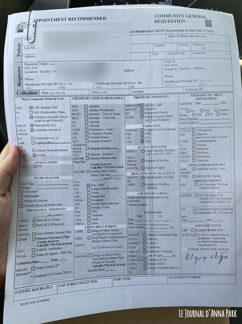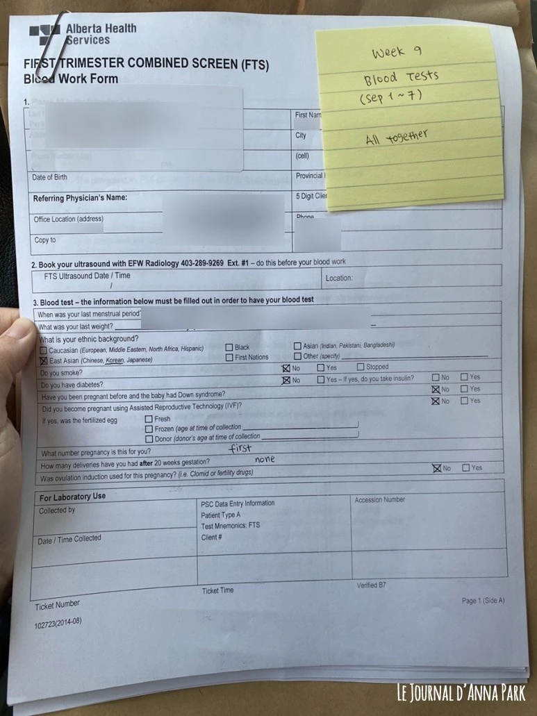 11주가 되었다. 12주 목덜미 투명대 초음파 검사(NT)가 일주일 앞으로 다가왔다. 한국에서는 병원에서 하루 만에 초음파로목투명대 두께도 검사하고, 피검사도 끝내는 것으로 알고 있다. 캐나다에서는 초음파를 보는 센터와 피검사를 할 수 있는 임상검사소(Lab)가 별도기 때문에 따로따로 방문하여 검사를 받아야 한다. 초음파 검사 최소 3일 전까지는 피검사를 해야만, 초음파 검사 전에 내 헬스케어 정보로 피검사 결과가 등록되어서, 초음파를 보자마자 의사소견을 얻을 수 있다기에 7일 전인 오늘(2021년 9월 21일) 미리미리 다녀왔다. 장소는 지난번 임신 준비 때 피검사를 하러 다녀온 랩. 지난번에도 walk-in으로 8시쯤 갔다가 50분 넘게 기다렸었기 때문에 이번에는 예약을 하려고 했다. 하지만 코비드19 때문인지 예약이 두 달은 꽉 차 있었다. 결국, 이번에도 워크인으로 찾아가게 되는데….