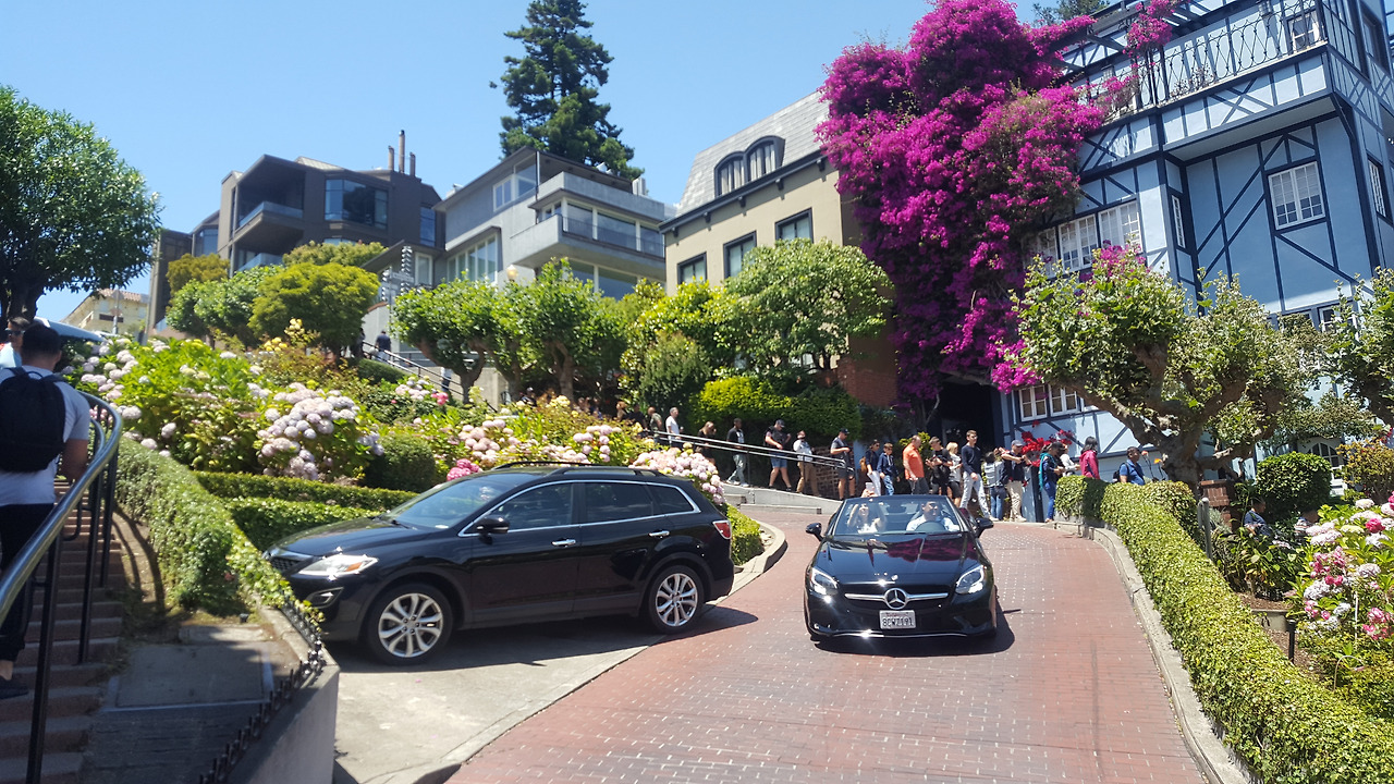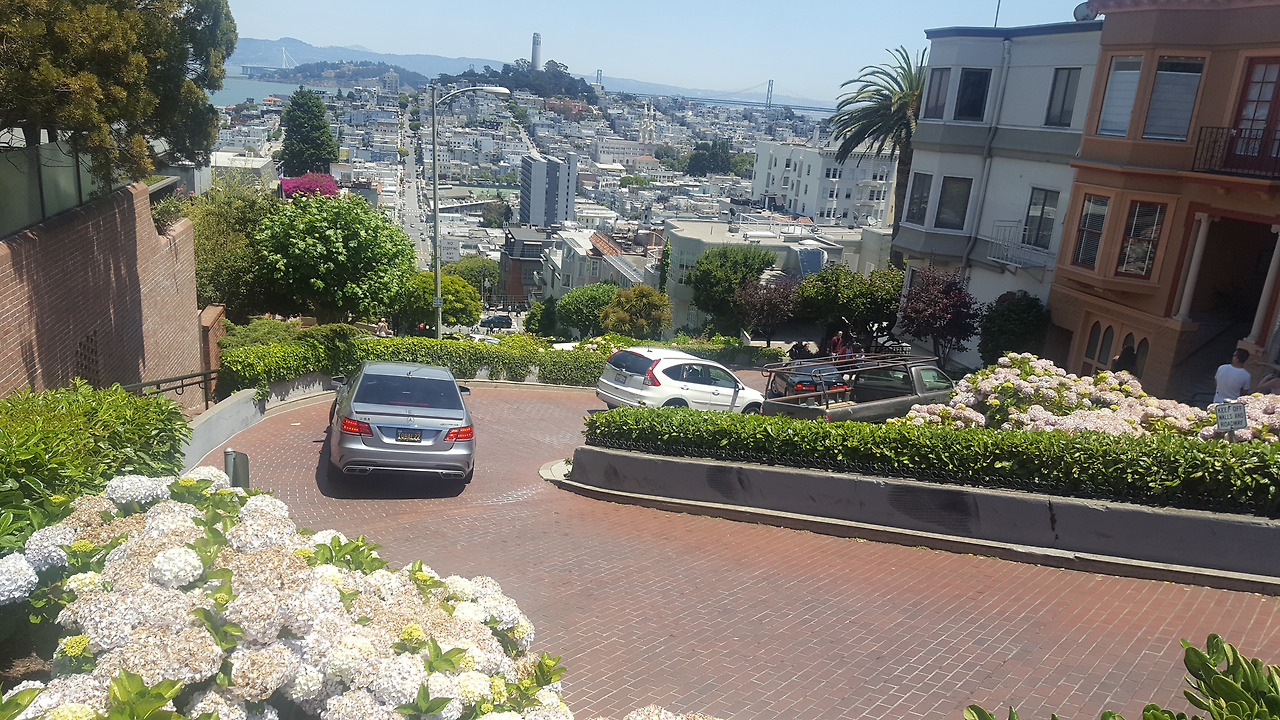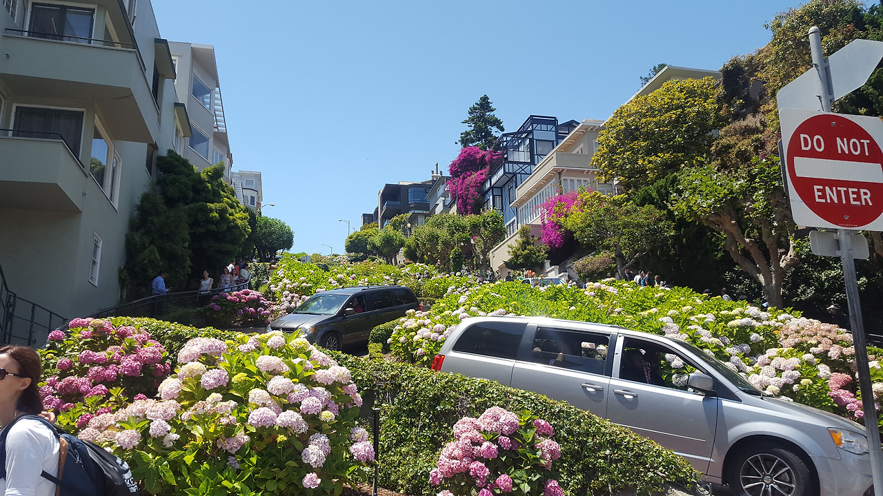 빅 버스가 언덕 아래서 내려줘서 언덕길을 열심히 올라가야 해요. 여기에 그 유명한 '세계 최고의 구불구불한 언 덕길 (The Crookedest Street in the World)이 있습니다. S 형태의 급 커브가 8개 있는 길입니다.