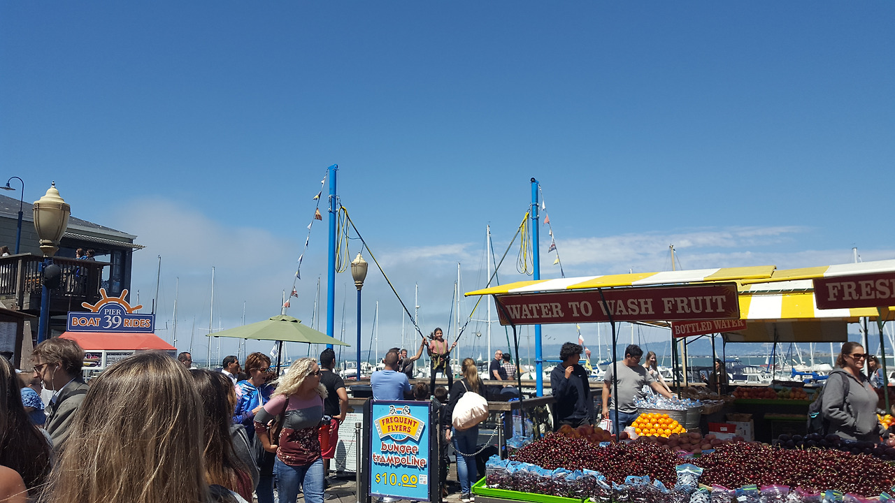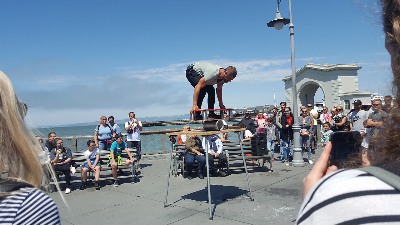 피셔맨스 와프에서 피어 39로 쭉 걸어가다 보니 어떤 아저씨가 저기 통에다가 계단을 쌓으면서 올라가는 묘기를 보여주고 있었어요.