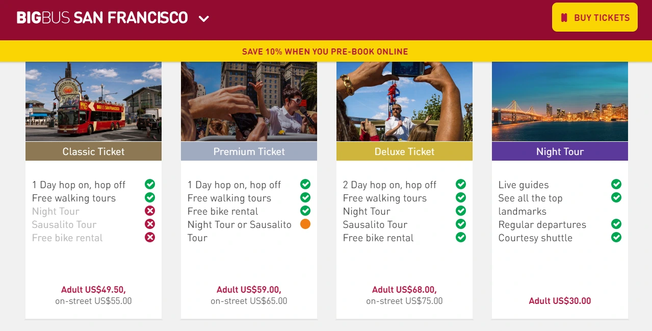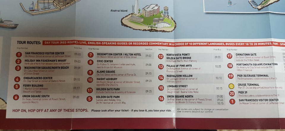 오전 9시 5분 유니언 스퀘어 시작 - 알라모 스퀘어 - 금문교 - 수퍼두퍼 버거 점심 - 롬바르드 거리 - 피셔맨스 와프에서 보트 투어 (금문교, 알카트라즈) - 피셔맨스 와프 - 피어 39 - 호텔
