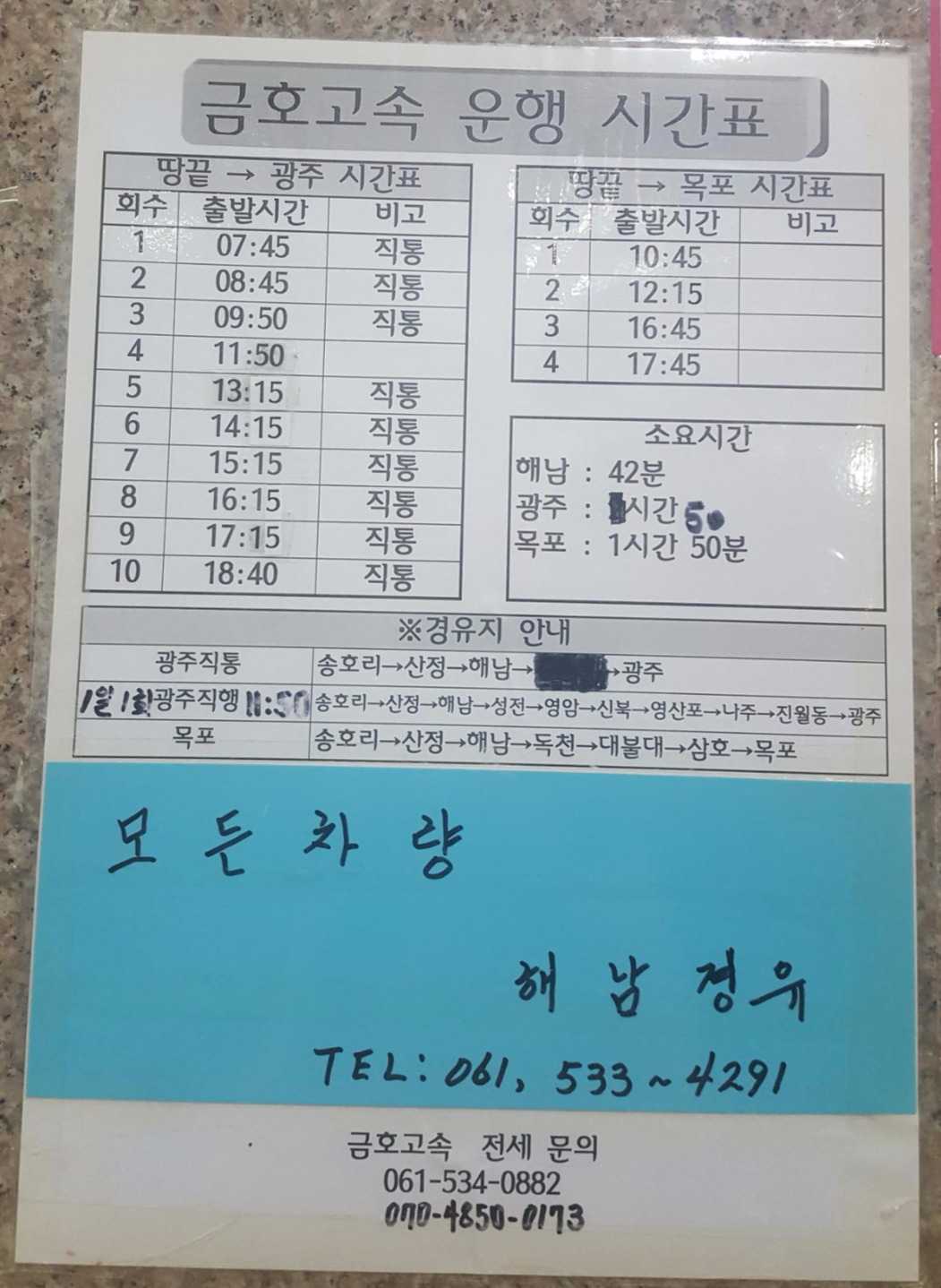 땅끝 마을에서 광주로 나가는 버스를 참고하세요~