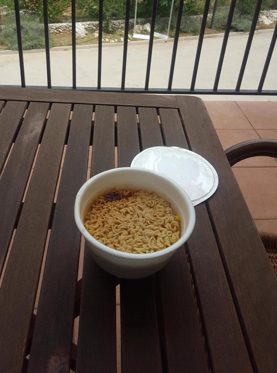 발코니에서 컵라면 촵촵. 프런트에 부탁해서 뜨거운 물 가져다 달라고 부탁했습니다.