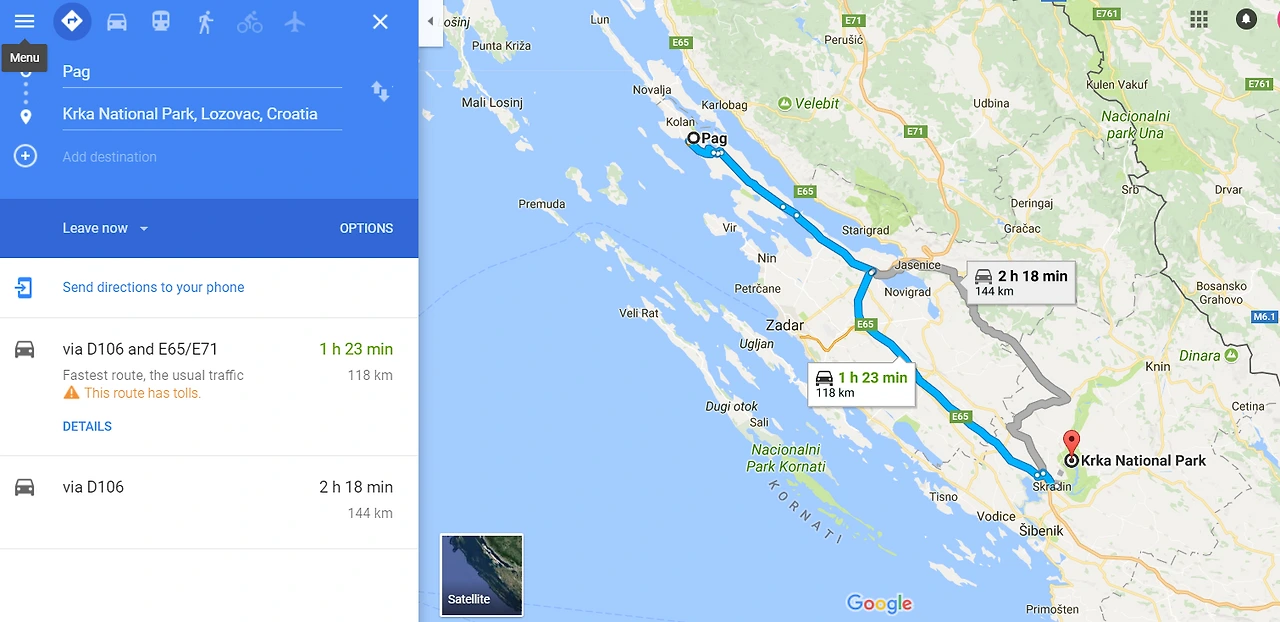 파그 섬에서 크르카 국립공원까지는 약 1시간 30분 걸리네요.