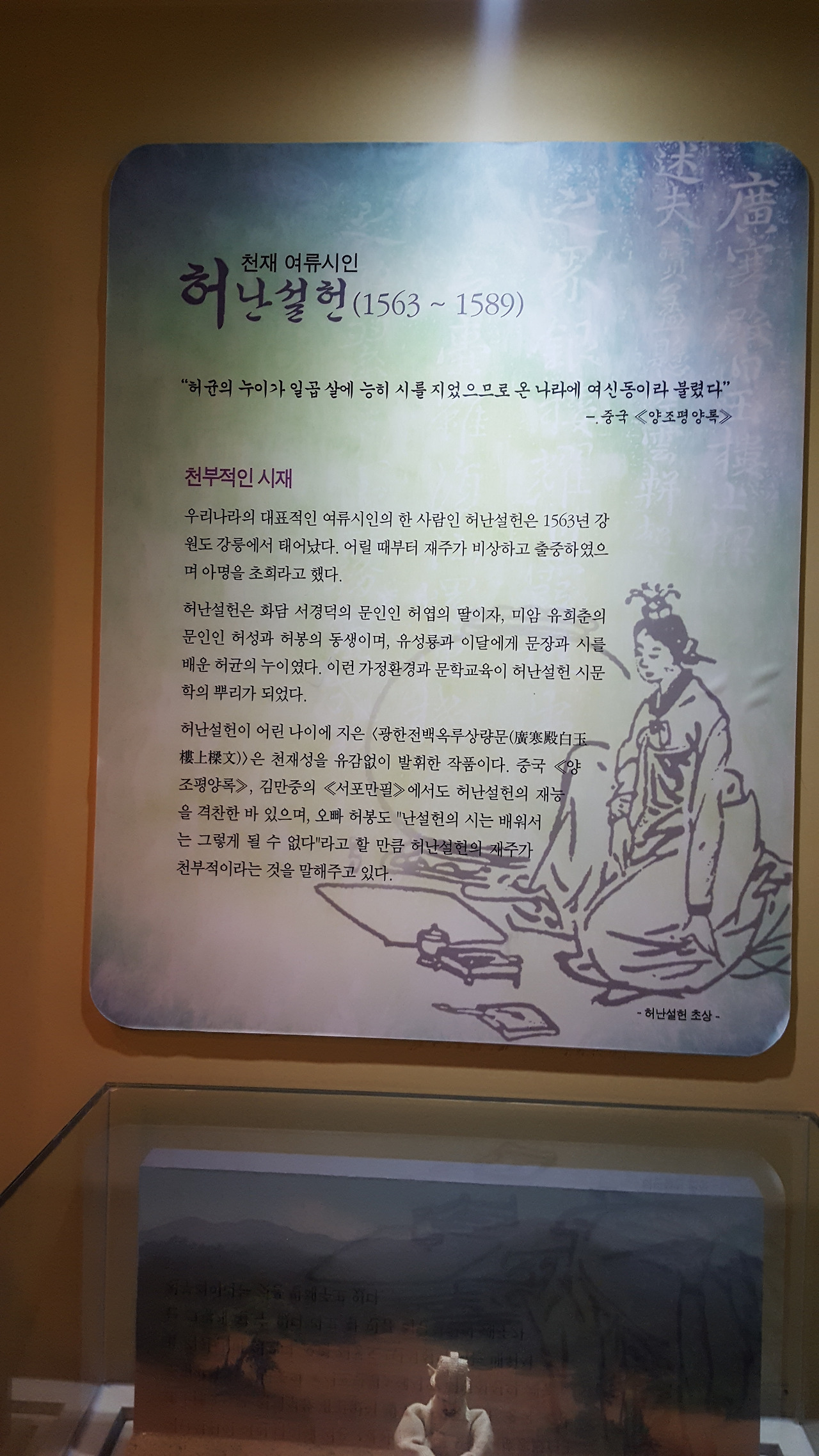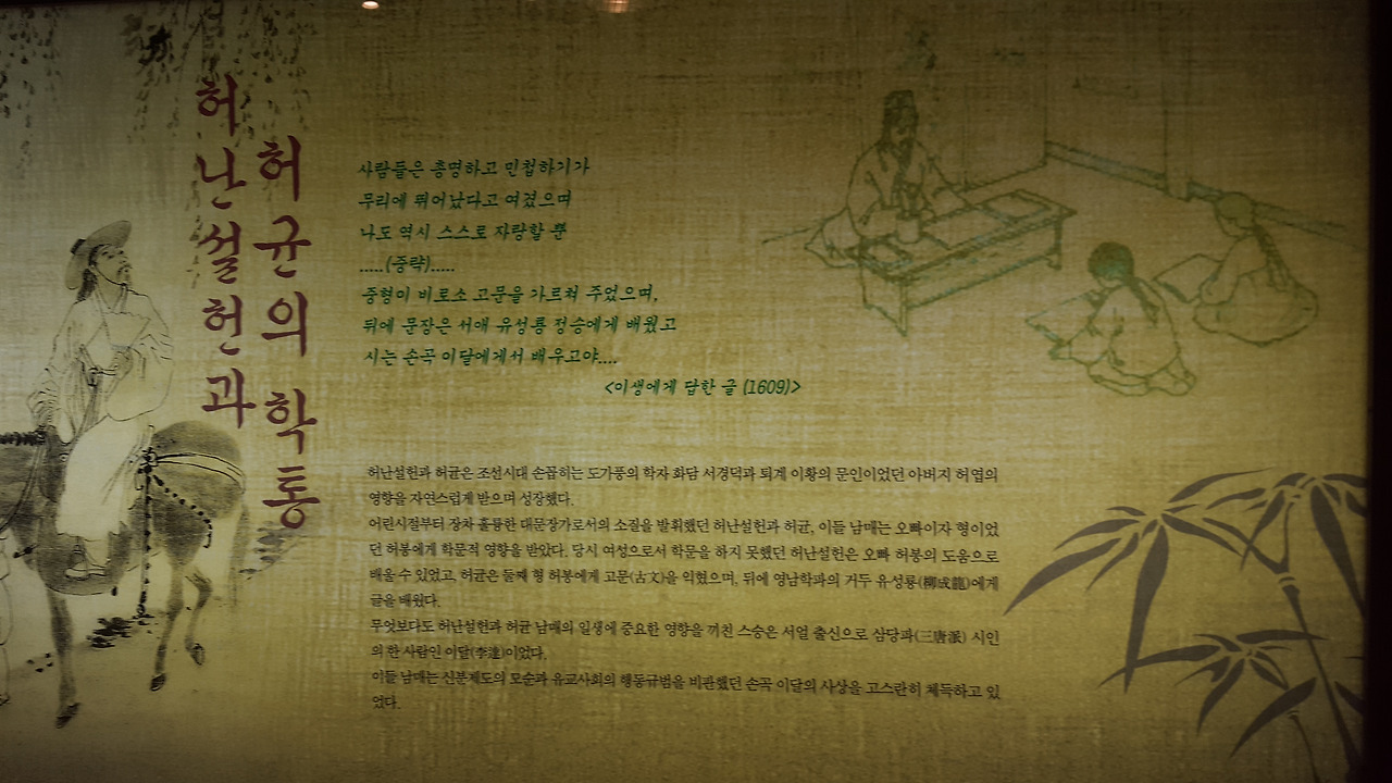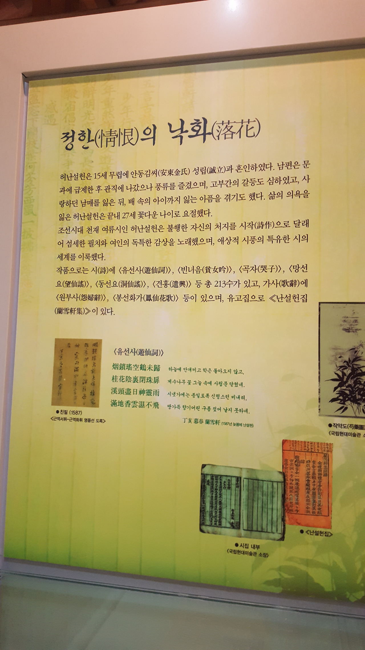 조선시대 대표적인 시인이었던 허난설헌. 홍길동으로 유명한 허균의 누이기도 합니다. 조선이란 시대를 잘못 만나 자신의 재능을 다 펼치지도 못하고 요절하셨다고 합니다. 알쓸신잡에서 너무 뛰어난 분이었는데 여성으로서 제약이 많다 보니 화병 나서 돌아가신 것 같다고 했습니다. ㅡㅜ