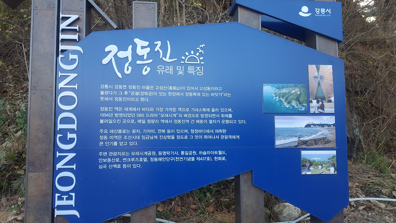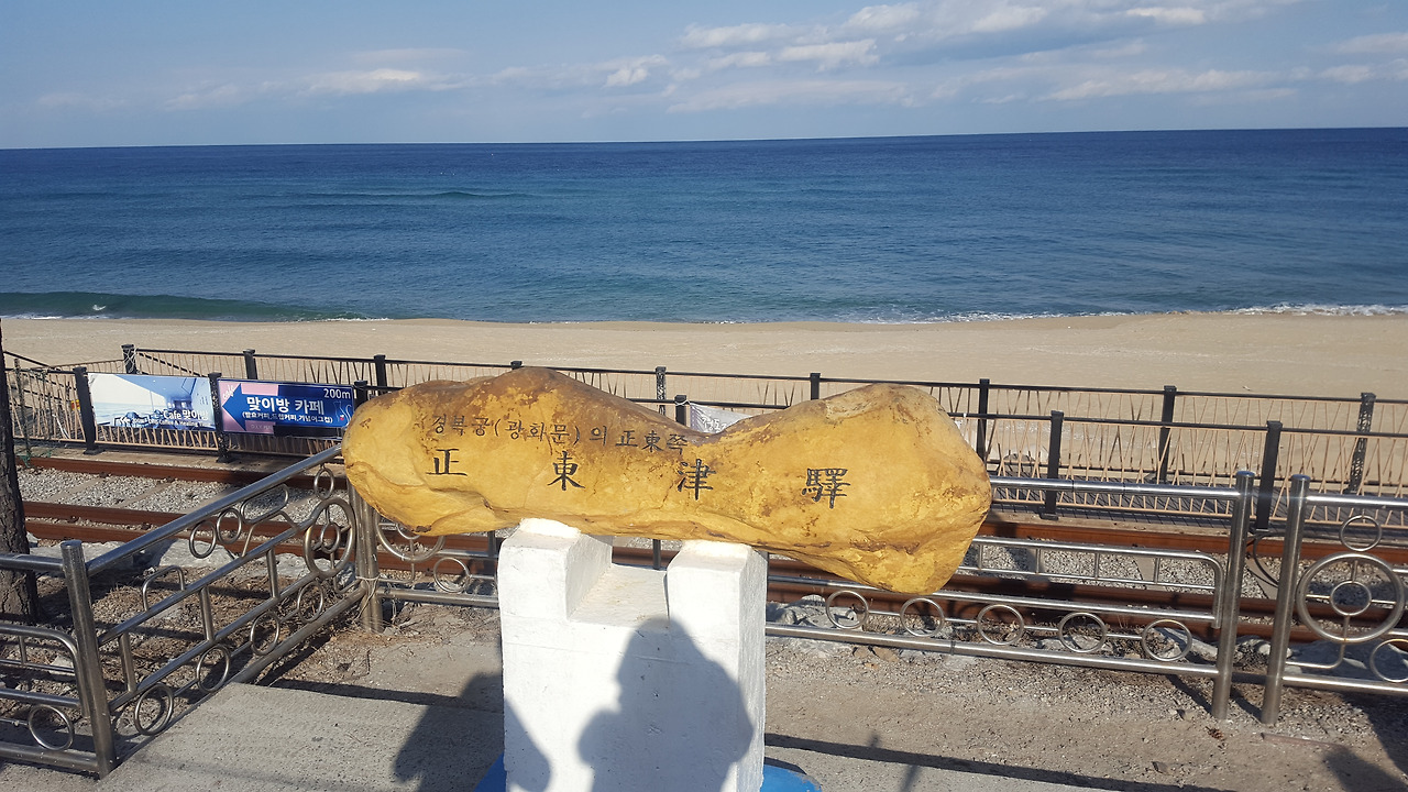 밥 먹고 약 1분 떨어진 정동진 무료주차장에 주차를 하고 바다를 걸었습니다. (정동진 해변 주차장) 정동진 이름의 유래는 경복궁이 있는 한양에서 정동 쪽에 있는 바닷가라는 뜻에서 '정동진'이라는 이름이 붙었다고 하네요.