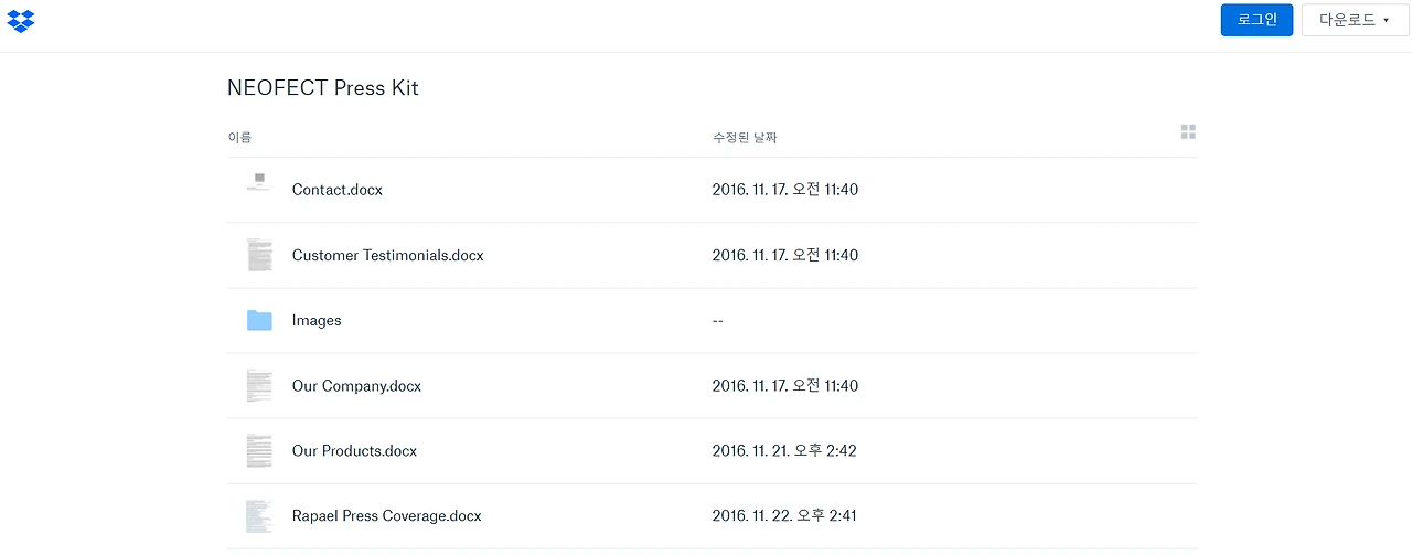 네오펙트 영문 프레스킷 예시: https://drive.google.com/drive/u/1/folders/1He-ds3ELcjj06ZNW5GX8BR4MYoTpqroj