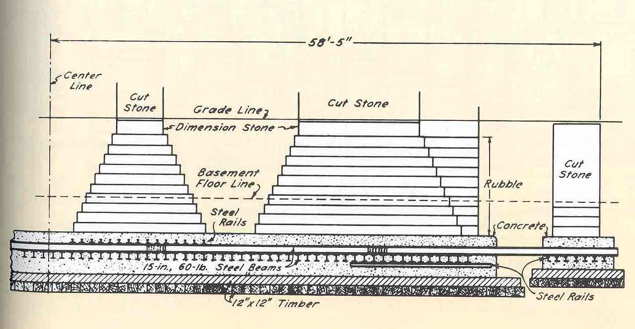 오디터리움 빌딩의 물컹한 지반 때문에 19세기말 철도구조 얹고 콘크리트를 들이 부은 여러겹의 안정화 공사가 진행되었다.