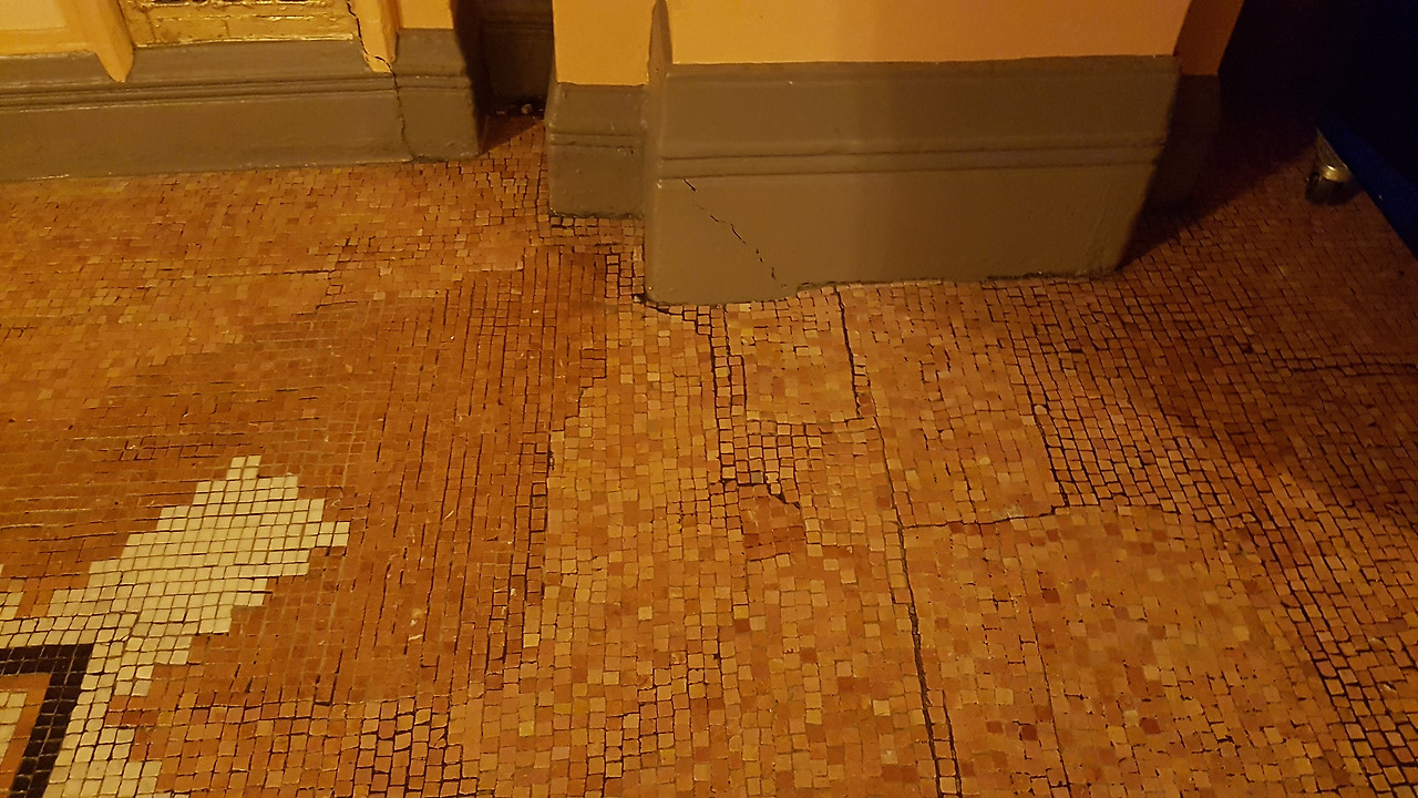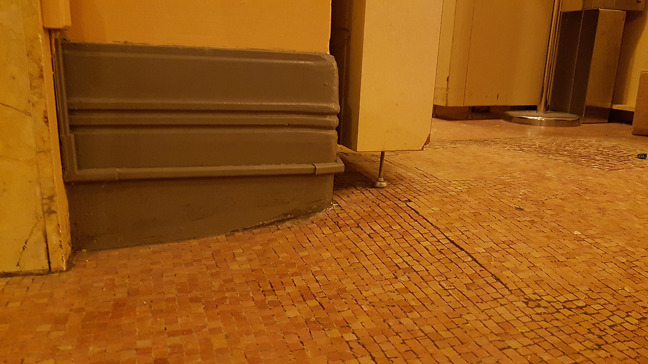 로비 아치의 오른편을 보면 기둥 바로 윗부분에서 포물선을 그리며 찌그러진 것이 육안으로 관찰된다. 사진 포샵한것 아닙