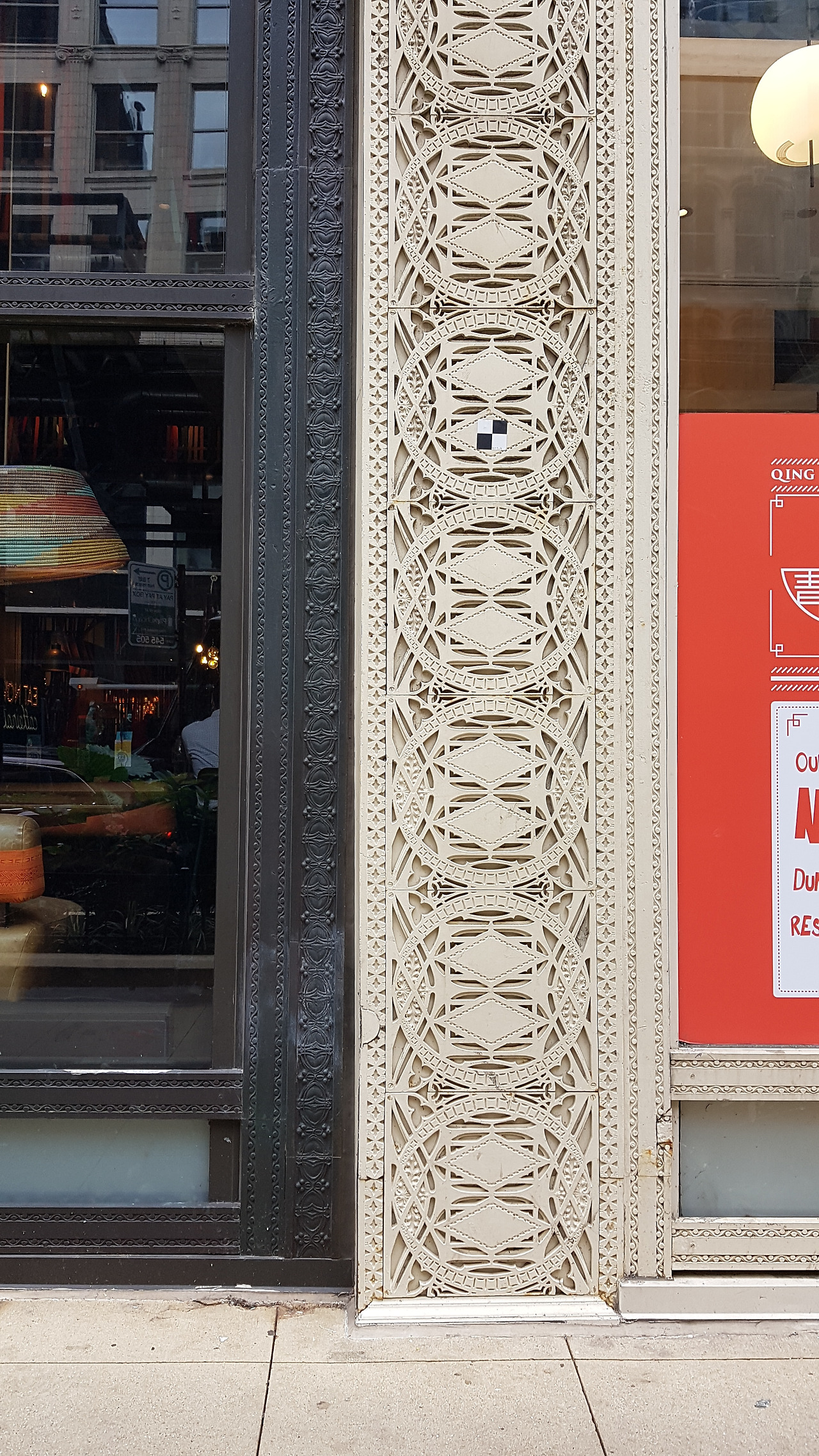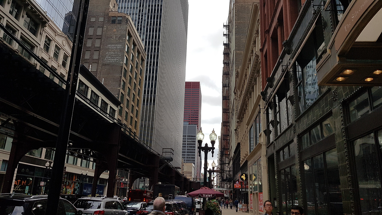 건물 앞 철제 장식이 루이스 설리반의 유기적인 모듈답다. 너무 가까운 데에 있었던 그의 작품. 지하철과 많이 붙어있어 그 그림자에 조금 어두운 가게들이다. 투어 하는 사람들이 웅성웅성 서 있을 만큼 인도가 넓은 곳이 아닌지라 인솔자도 급히 설명하고 다음 장소로 이동했다.