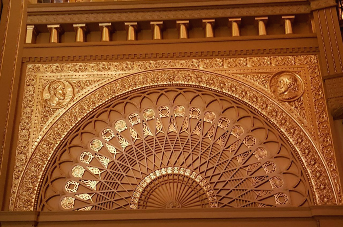 메인 출입구 위 장식. 아치 양쪽에 루이스 H. 설리반의 이니셜이 새겨져 있다.