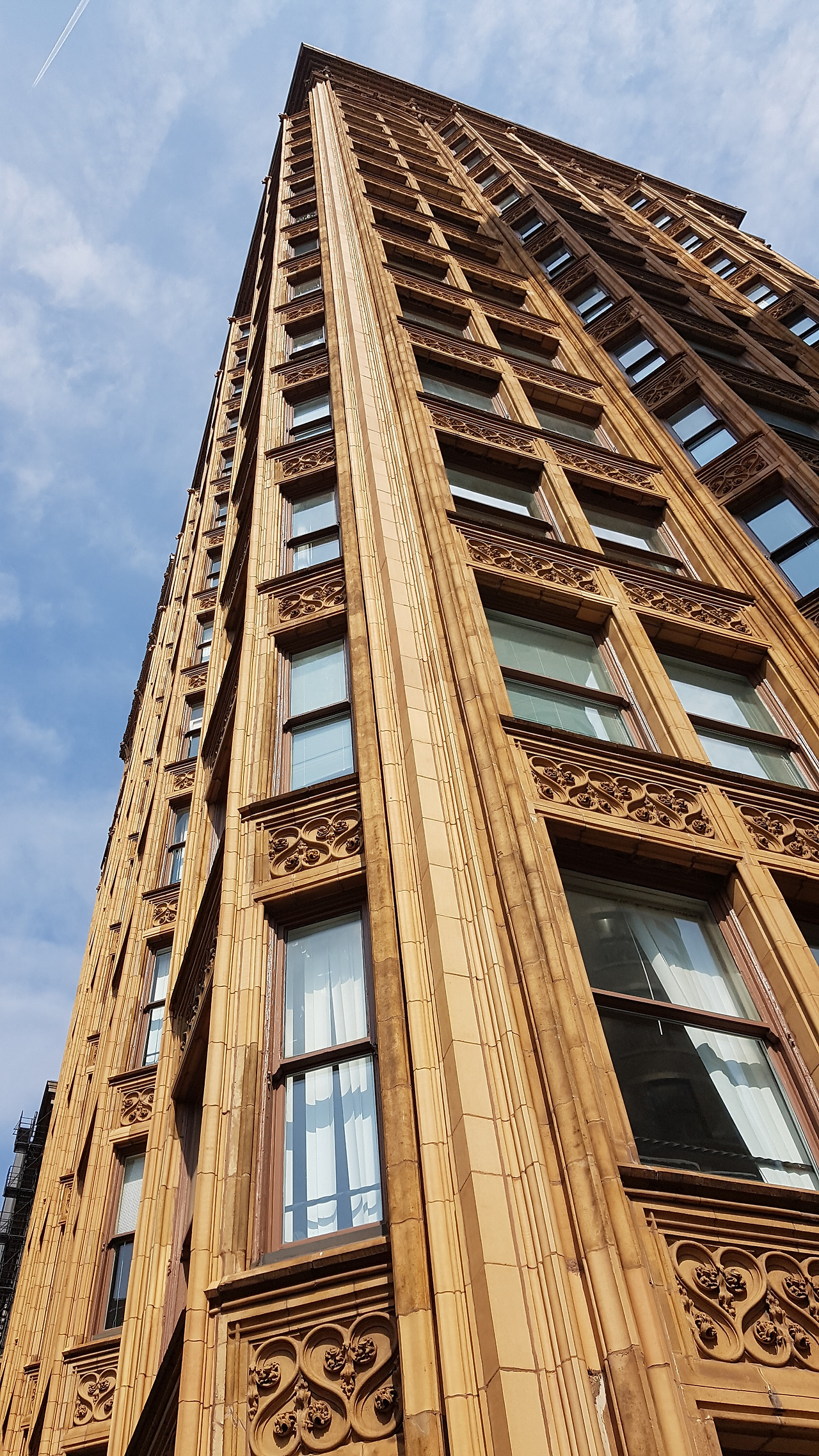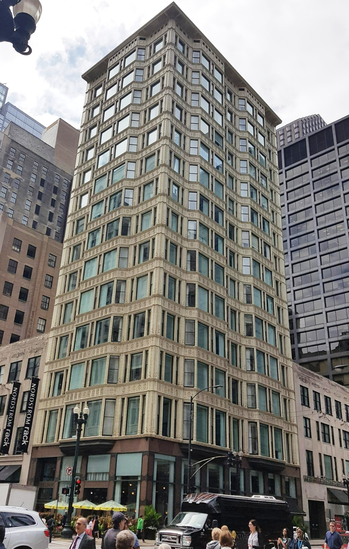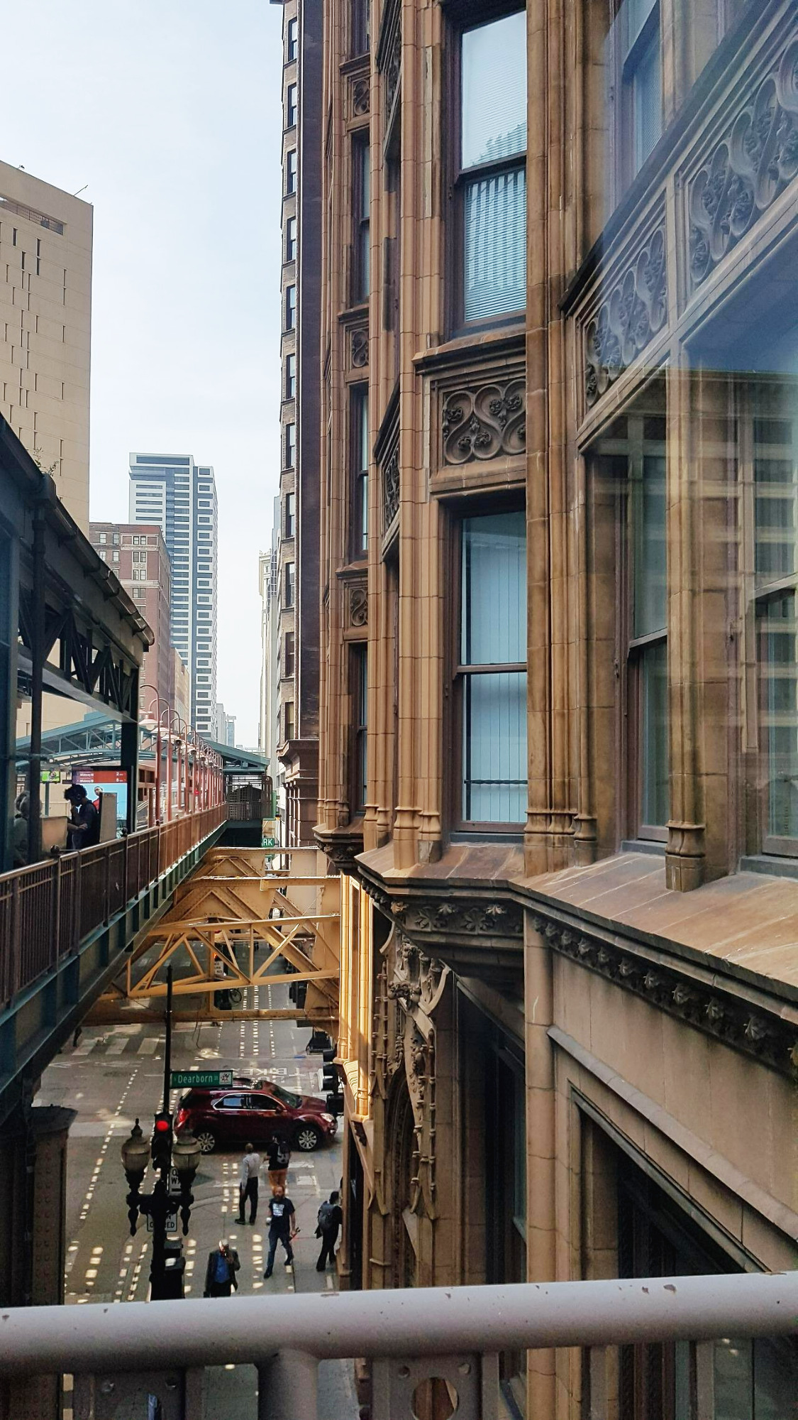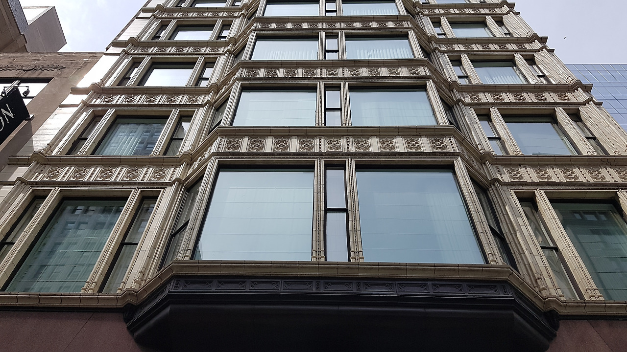 고가도로 지하철역에서 찍은 피셔 빌딩, 테라코타 장식이 많은 네오고딕 스타일이지만 엄연히 20층짜리 철골 빌딩. 수직선의 골기가 강해 보인다.