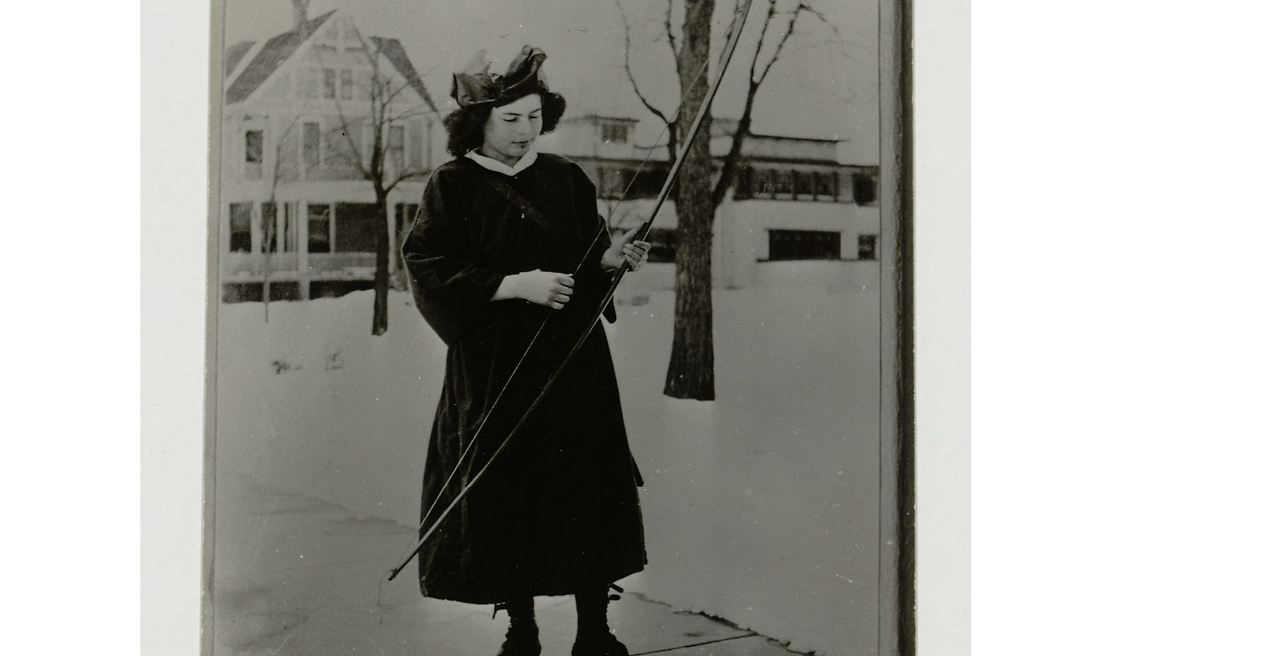 로빈 후드 복장을 한 어린 헤밍웨이. 1912년. 뒤의 건물이 홈즈 초등학교. 뒷 목조 건물은 1958년 헐리고, 퍼킨스 앤 윌이 설계한 콘크리트 건물이 들어섰다.