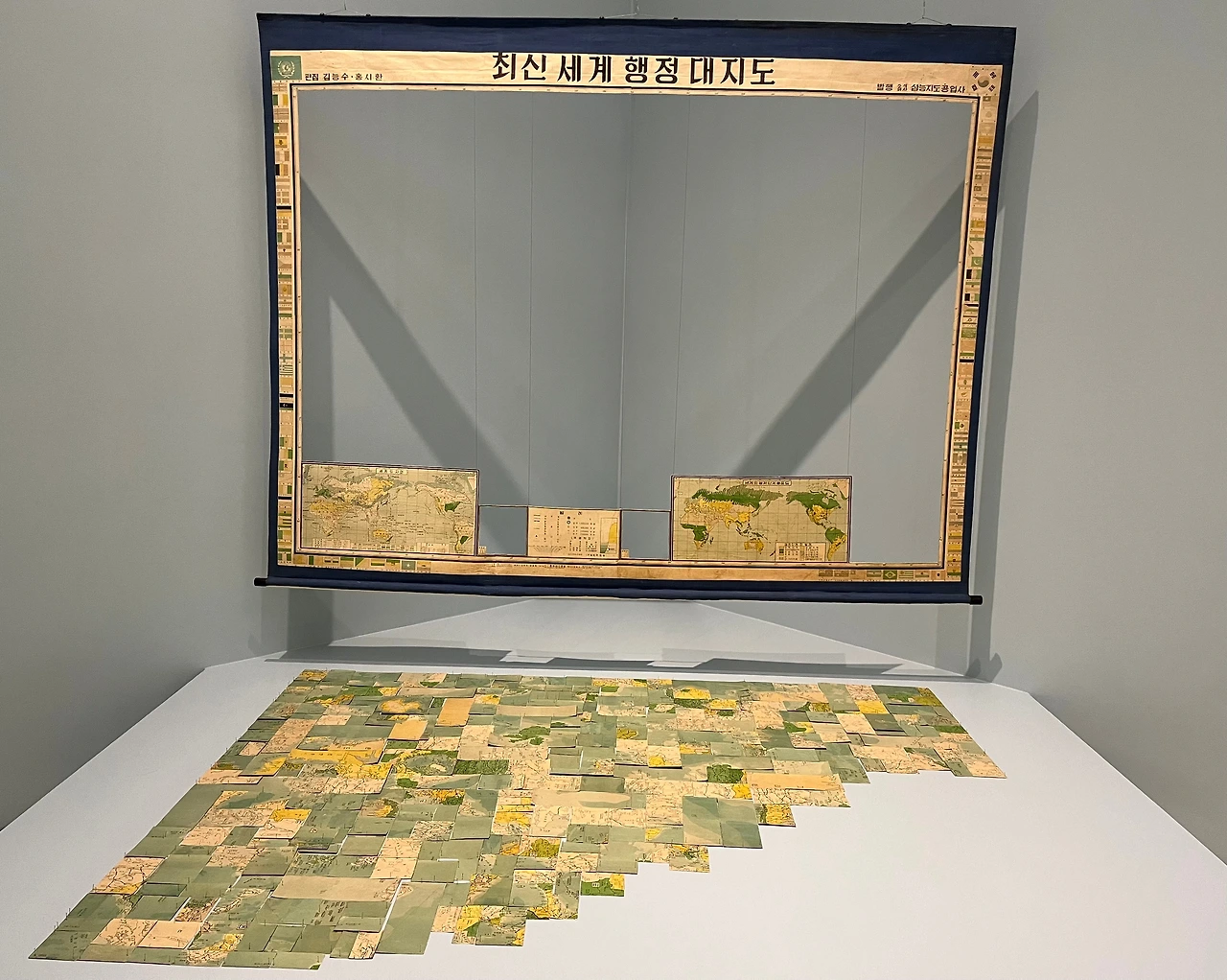 그의 작품 <세계전도>에서, 그는 지도의 틀만 남겨놓고 삼백 개의 조각을 오려냈다. 그러고 나서 같은 크기의 조각들을 무작위로 배치해 무의미하고 읽을 수 없는 지도를 만들었다. 그는 자신의 작품 속에서 우리가 수세기에 걸쳐 알고 있던 지정학적, 문화적 틀에서 벗어난 새로운 세계를 재창조하려 했다.