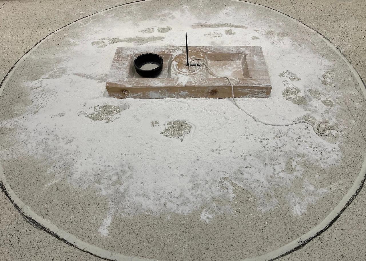 1974년 국립현대미술관에 처음 설치된 이 작품은 존재의 무상함, 변형, 유동성에 대해 숙고한 것이라 한다. 최초의 전시에서는 그 지역 사람한테서 닭을 빌려와 짚으로 만든 매트 위의 나무 사료통에 밧줄로 묶고, 바닥에 뿌려놓은 하얀 가루 위에서 닭이 어떻게 움직이는지를 보여주었다고 한다. 이후 전시에서는 닭이 주인에게 돌아가고 나서 남은 흔적을 보여준다.