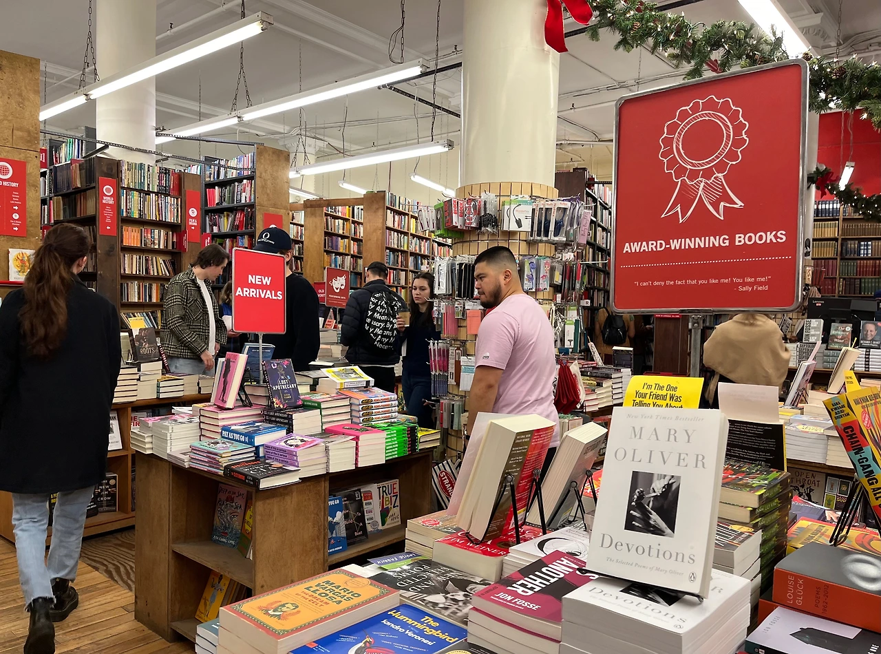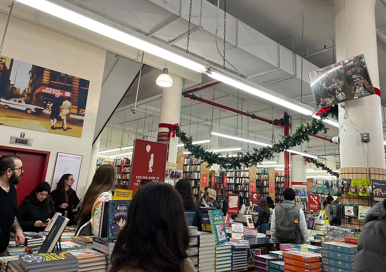 음료를 무료로 제공하는 곳도 있어 바 앞에 장사진을 이룬 산타들의 행렬을 볼 수 있었다. 근처에 NYU(New York University)가 있는 데다 축제일이라 서점도 덩달아 붐볐다.